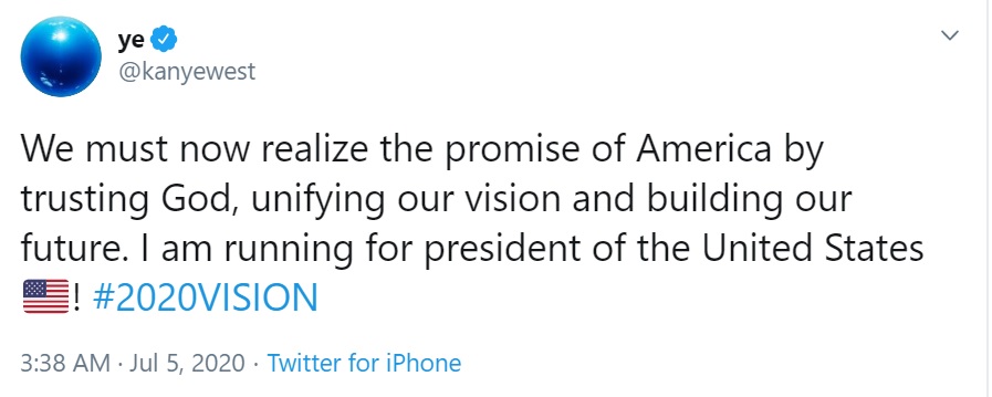 "Мы должны воплотить надежды Америки с верой в Бога, объединив наше видение и построив наше будущее. Я баллотируюсь на пост президента США", — написал Канье.