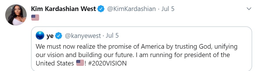 Его решение уже поддержала жена — Ким Кардашьян, оставив в качестве комментария на сообщение Уэста флаг США.