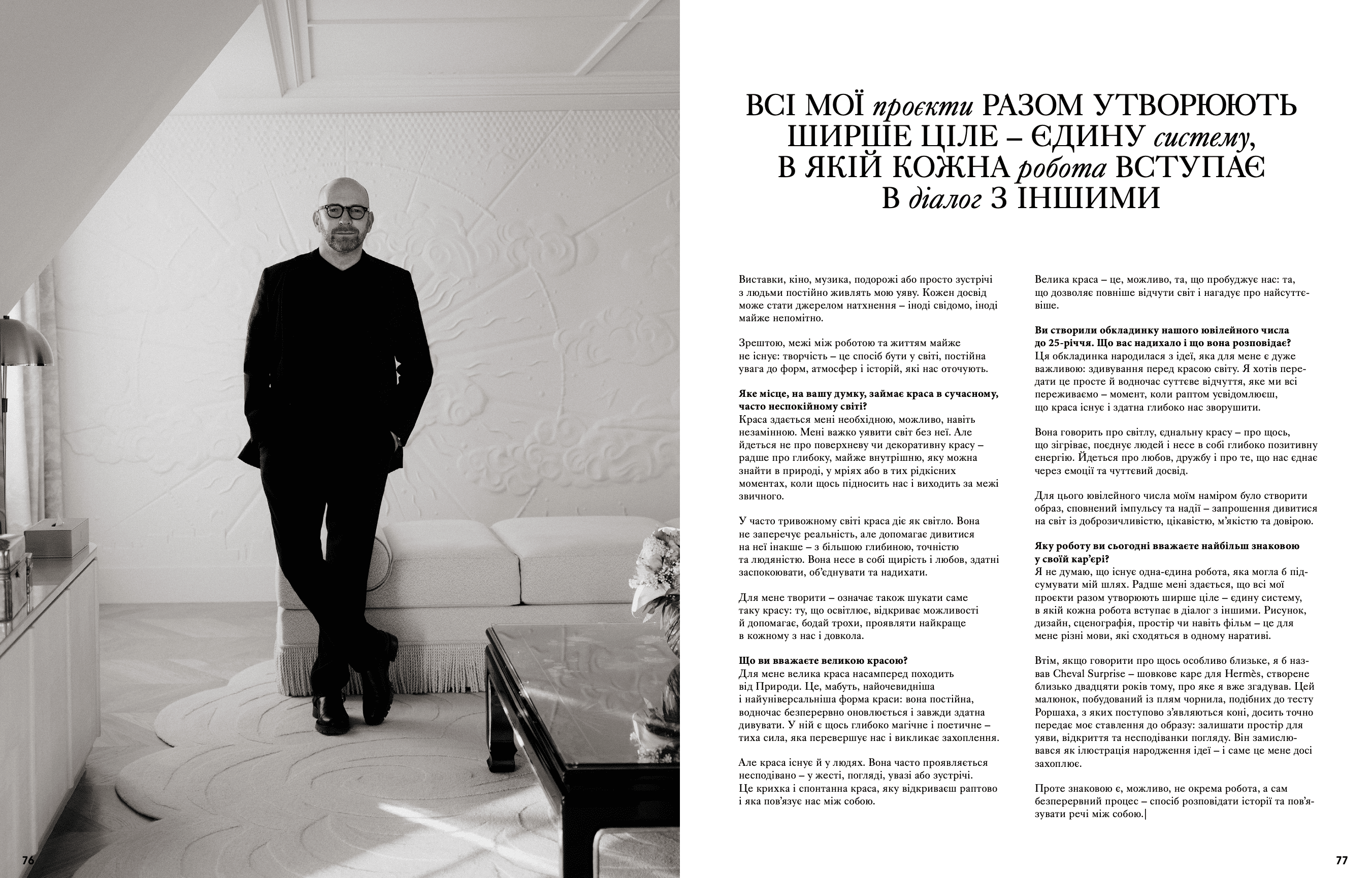 «Ця обкладинка народилася з ідеї, яка для мене є дуже важливою: здивування перед красою світу. Я хотів передати це просте й водночас суттєве відчуття, яке ми всі переживаємо – момент, коли раптом усвідомлюєш, що краса існує і здатна глибоко нас зворушити. Вона говорить про світлу, єднальну красу – про щось, що зігріває, поєднує людей і несе в собі глибоко позитивну енергію. Йдеться про любов, дружбу і про те, що нас єднає через емоції та чуттєвий досвід. Для цього ювілейного числа моїм наміром було створити образ, сповнений імпульсу та надії — запрошення дивитися на світ із доброзичливістю, цікавістю, м’якістю та довірою».