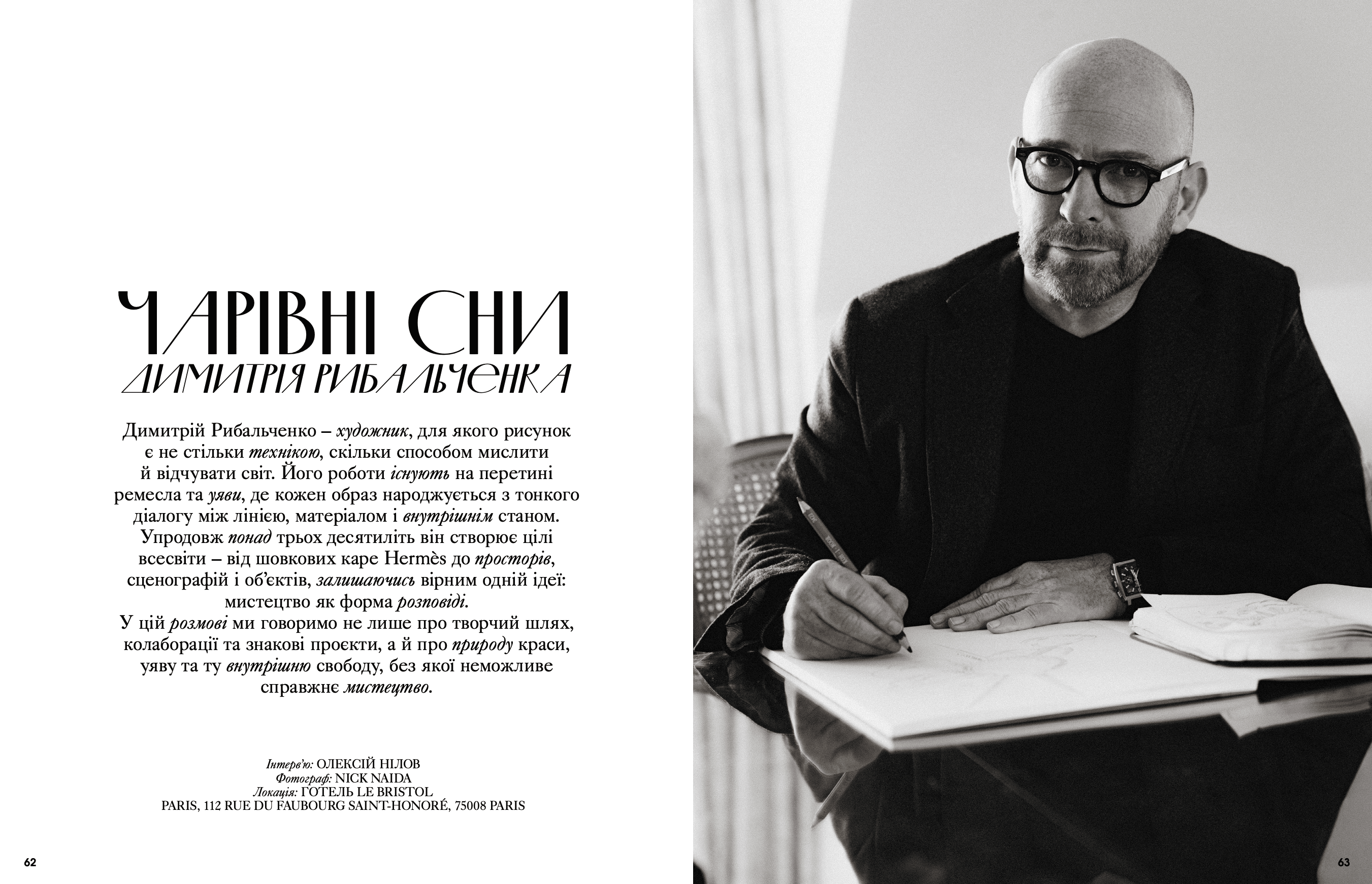 Артобкладинку до ювілейного колекційного числа створив Димитрієм Рибальченком — художник, для якого рисунок є не стільки технікою, скільки способом мислити й відчувати світ. Його роботи існують на перетині ремесла та уяви, де кожен образ народжується з тонкого діалогу між лінією, матеріалом і внутрішнім станом. Упродовж понад трьох десятиліть він створює цілі всесвіти — від шовкових каре Hermès до просторів, сценографій і об’єктів, залишаючись вірним одній ідеї: мистецтво як форма розповіді.
