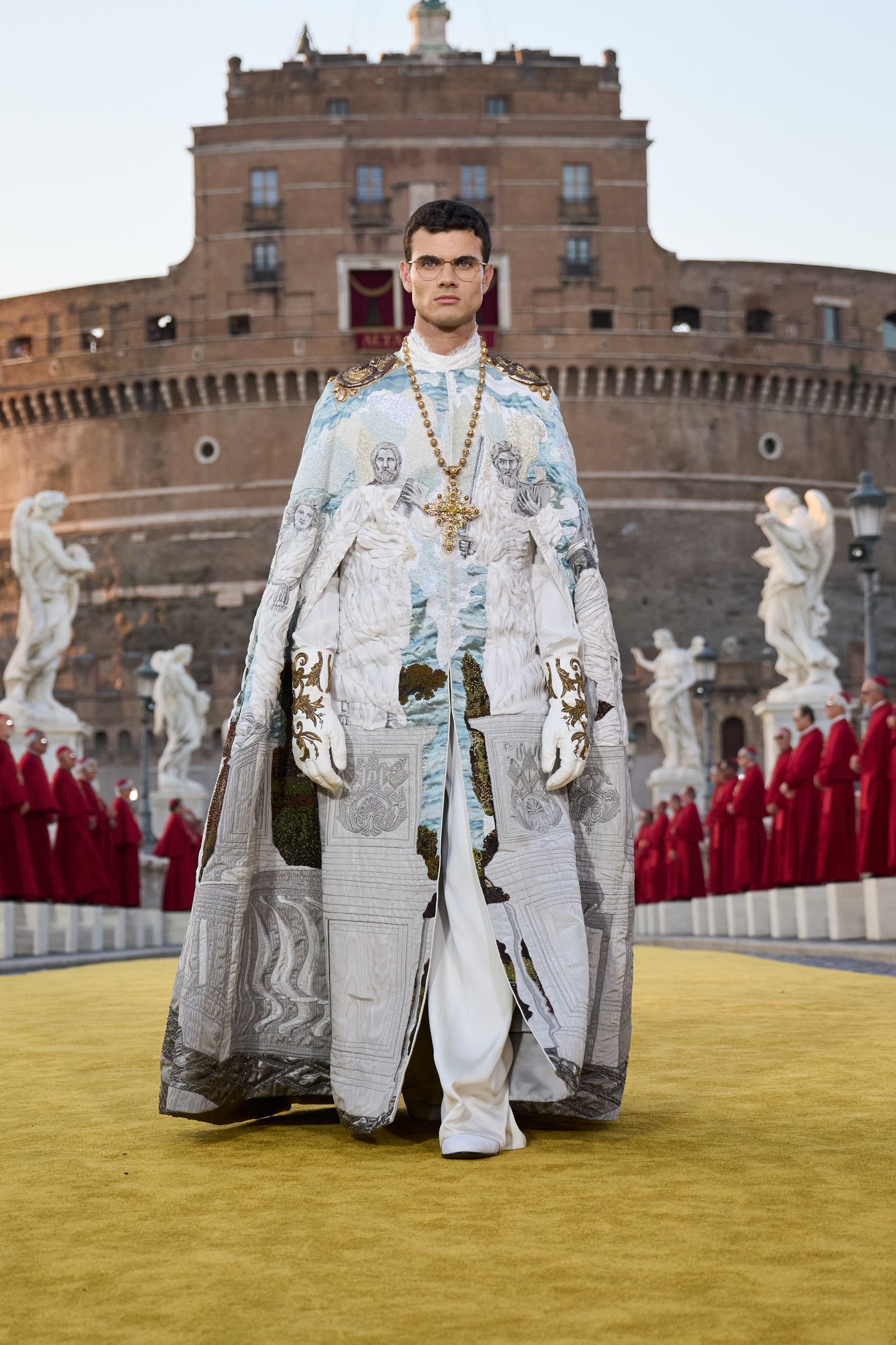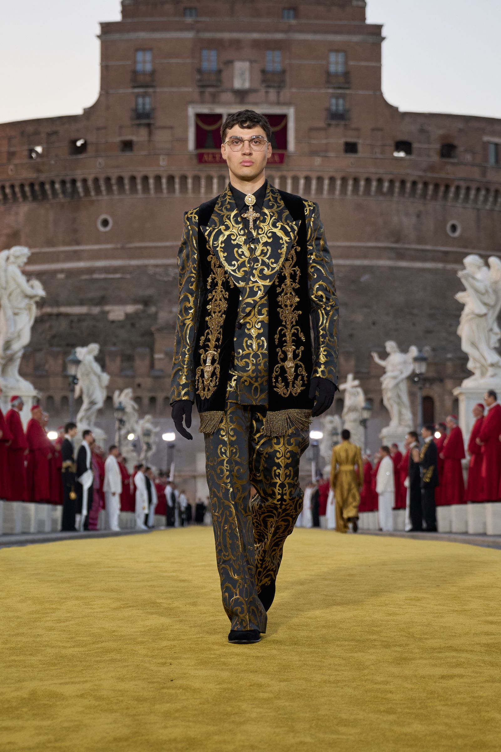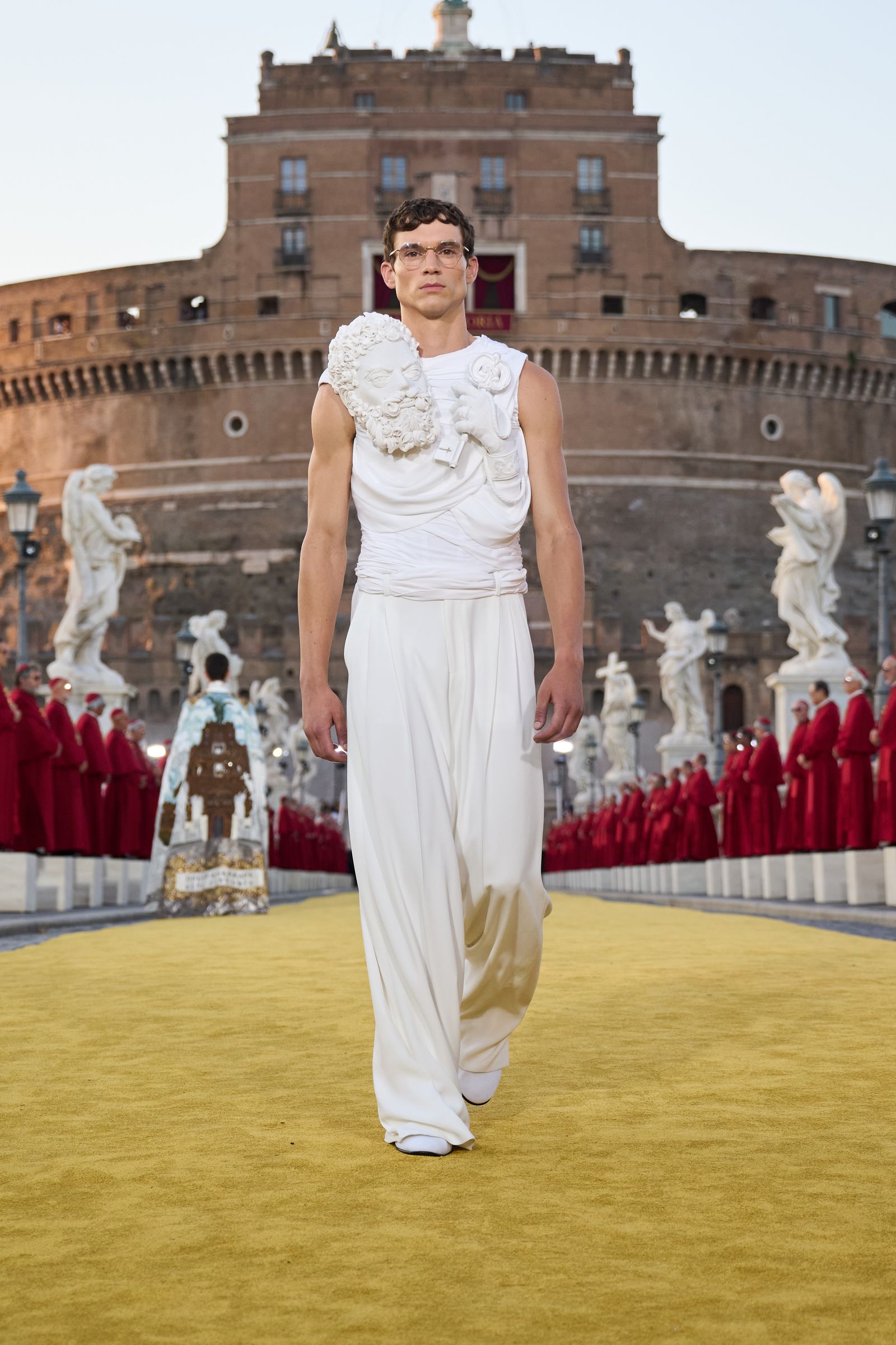 Після масштабного жіночого показу серед історичних руїн Римського форуму, Dolce & Gabbana представили чоловічу колекцію на фоні іншої архітектурної пам’ятки — мосту Понте Сант’Анджело, що веде до замку Святого Ангела. Зведений ще у II столітті за імператора Адріана, цей міст із часом став не лише стратегічною спорудою, а й частиною візуального образу міста: середньовічна фортеця, папська резиденція, декорація для фільму «Римські канікули». У день показу замок перетворили на театралізоване тло — з яскравим освітленням і акторами, стилізованими під кардиналів.