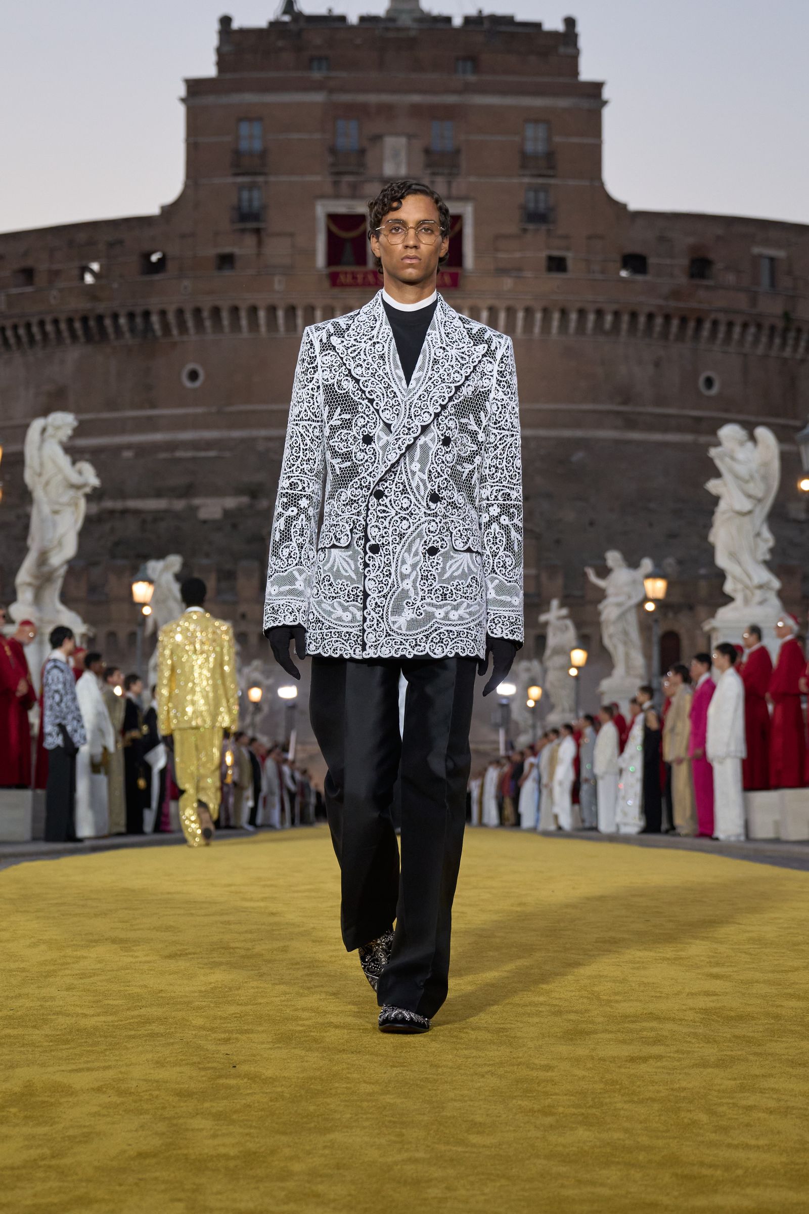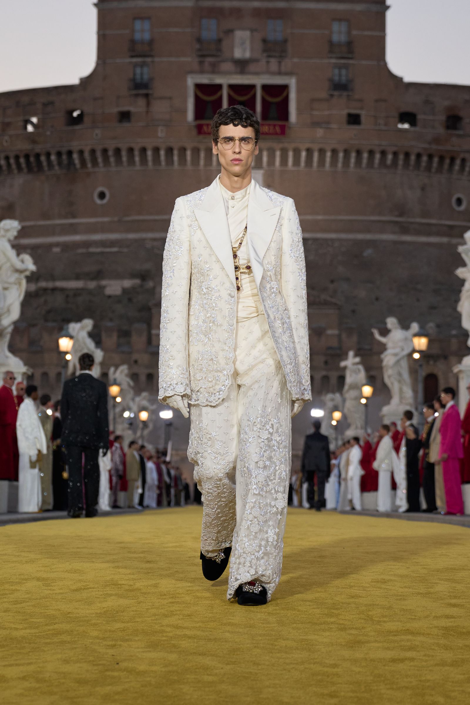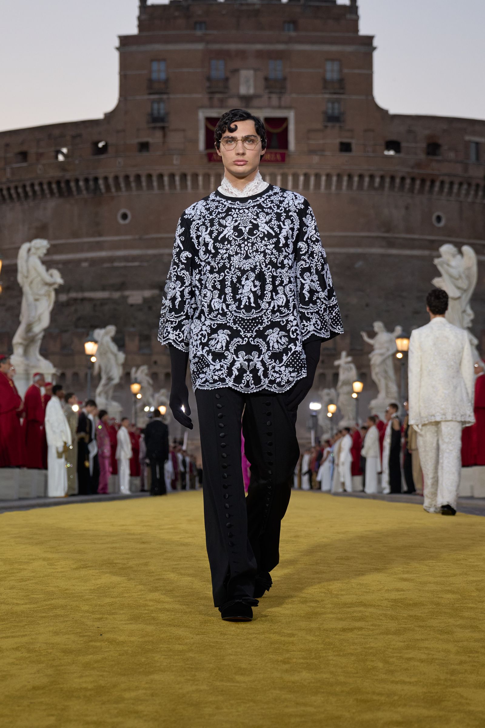 Після масштабного жіночого показу серед історичних руїн Римського форуму, Dolce & Gabbana представили чоловічу колекцію на фоні іншої архітектурної пам’ятки — мосту Понте Сант’Анджело, що веде до замку Святого Ангела. Зведений ще у II столітті за імператора Адріана, цей міст із часом став не лише стратегічною спорудою, а й частиною візуального образу міста: середньовічна фортеця, папська резиденція, декорація для фільму «Римські канікули». У день показу замок перетворили на театралізоване тло — з яскравим освітленням і акторами, стилізованими під кардиналів.