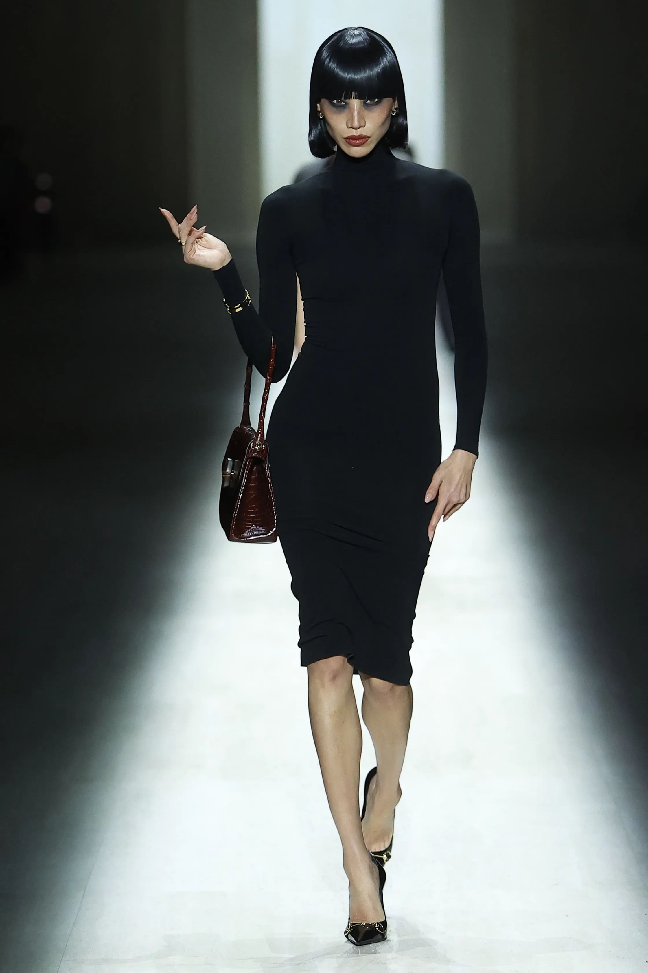 Естетика показу нагадала публіці про архівні колекції Тома Форда. Окрім знакових силуетів того часу, на подіумі було помітне й пряме цитування. У колекції з’явилась сукня з надглибоким вирізом на спині, яку, до речі, примірила Кейт Мосс.