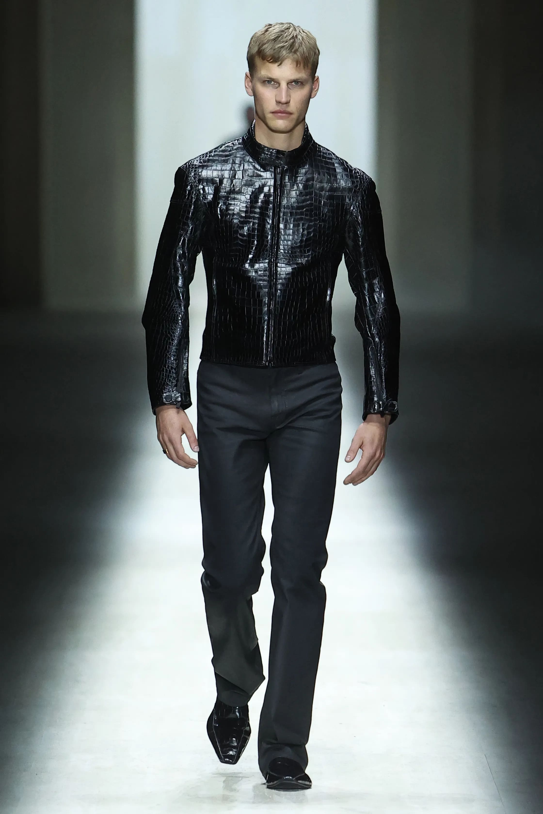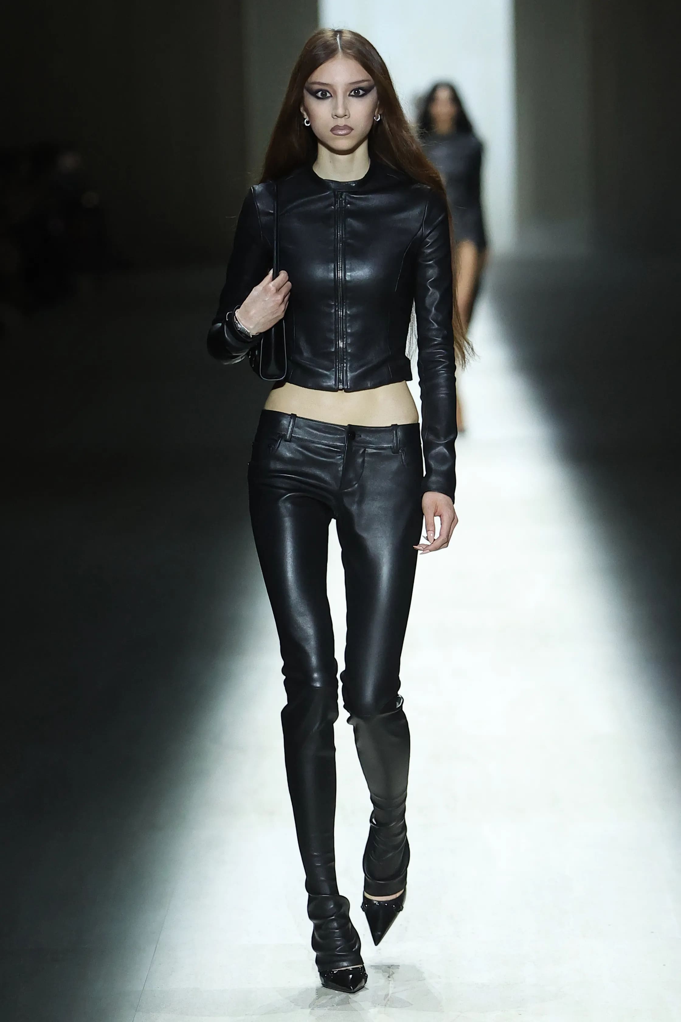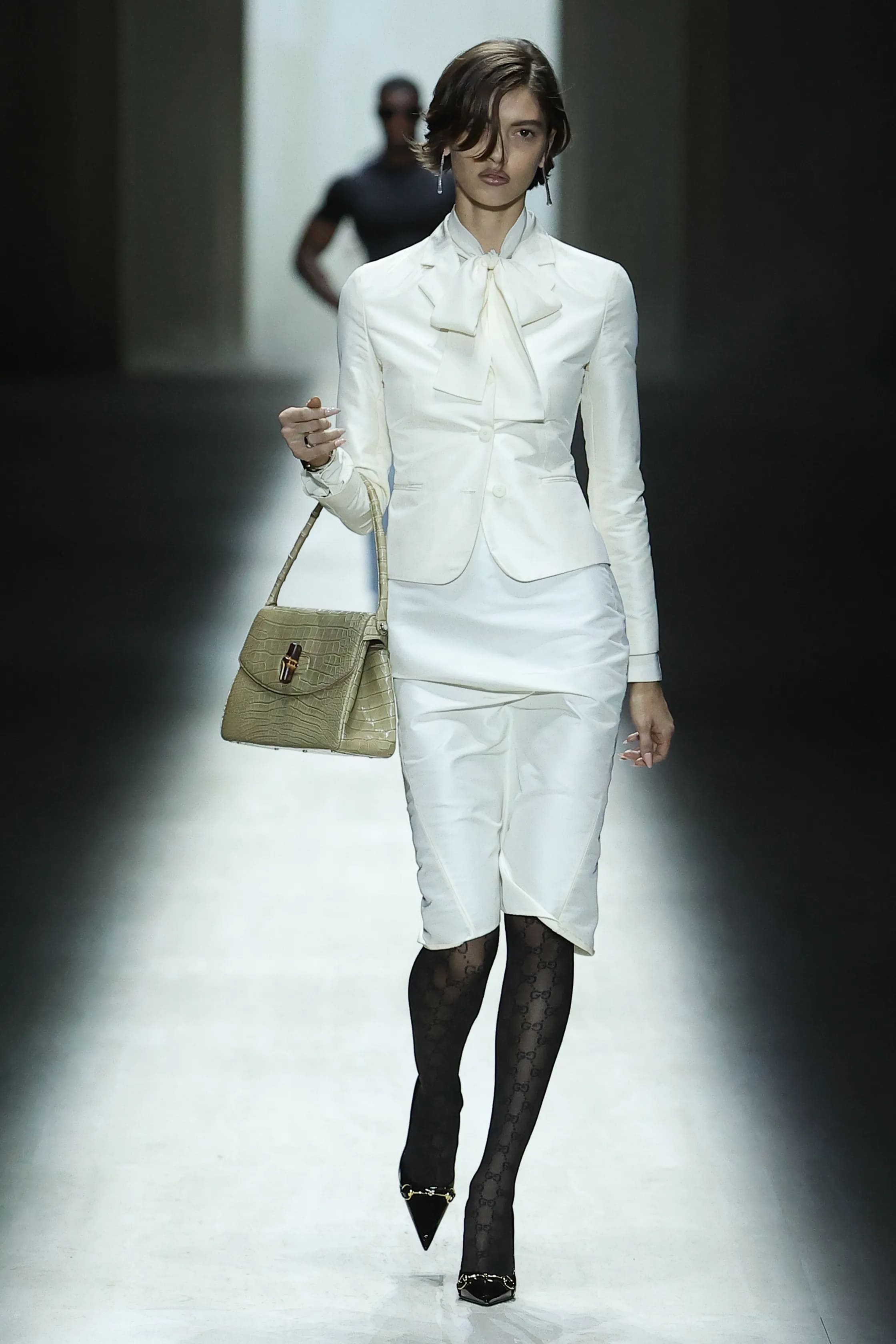 Шоу відкрив прийом, бачений публікою й раніше. Показ сезону fall-winter — 2026 розпочалося з білої сукні — натяк на чистий лист, у який Демна вписує своє ім’я в історію модного Дому. Приталені силуети та сміливі довжини продовжились і в інших образах з нової колекції: костюмах-двійках, шкіряних брюках, трикотажних топах, блузах тощо.