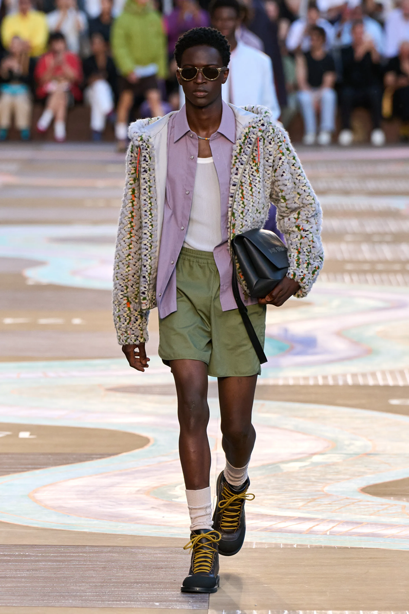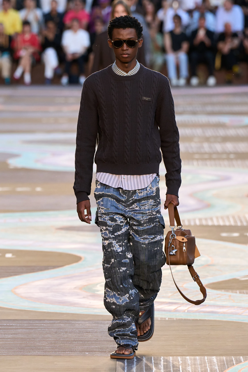 Що ж до шкіряних скринь з камінцями, перлами й у фіолетовому акрилі, котрі вивозили на подіум моделі, то вони були натхненні антикварними надбаннями Гастона Луї Віттона, внука засновника Дому. Зі свого боку протисонцеві окуляри з’явилися в межах нової лінійки LV Heritage: їхні металеві куточки нагадують про куточки скринь Будинку.