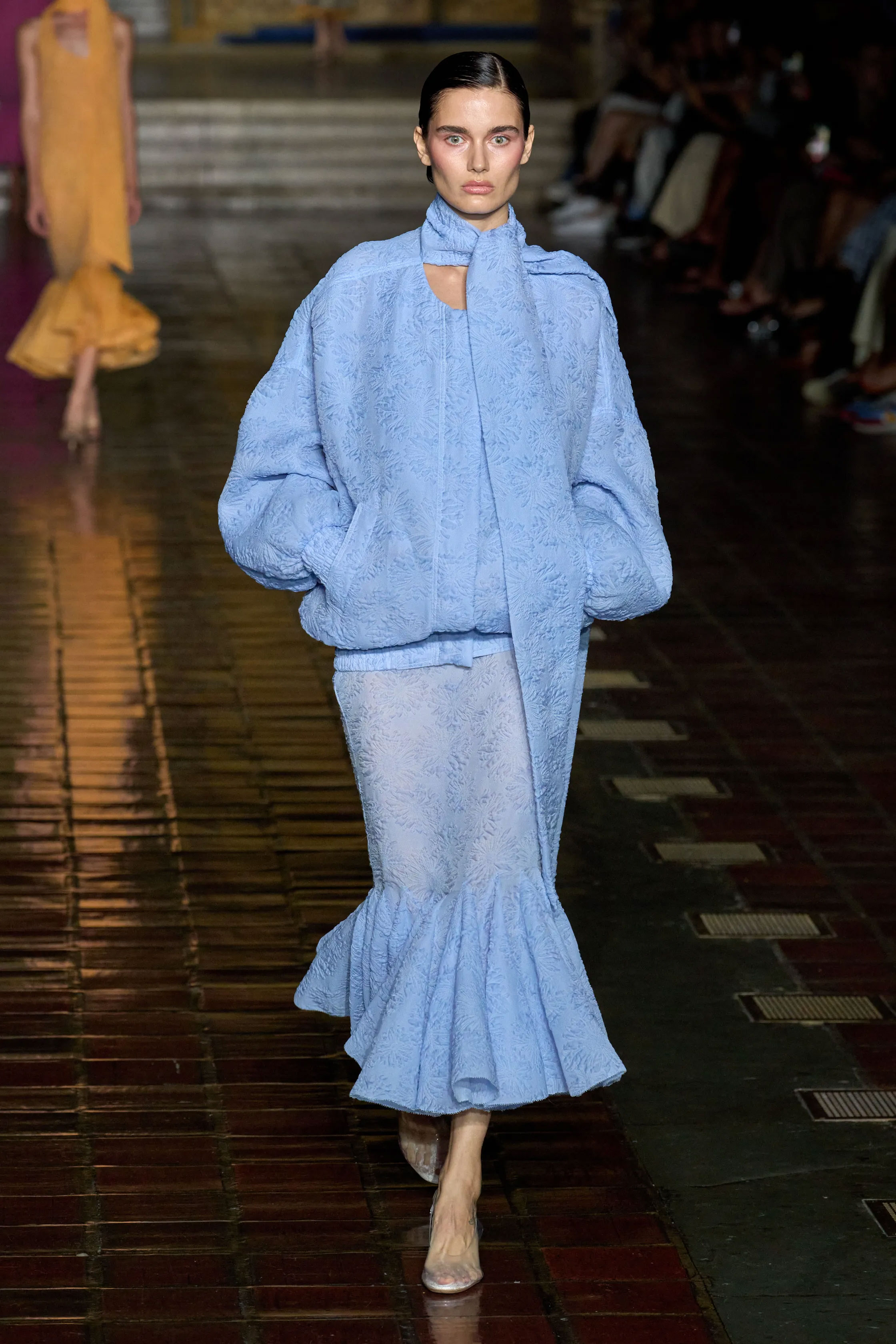 Технологічний світ став відправною точкою в створенні нової колекції Altuzarra. Перед шоу дизайнер зазначив, що його цікавить межа між реальністю та ілюзією — розмова про штучний інтелект і про те, як складно інколи відрізнити справжнє від вигаданого. Ця ідея втілилася у візуальних прийомах: квіткові візерунки на топах і сукнях, які спершу здавалися пласкими, насправді виявлялися тривимірними, а «палантин» виявлявся ілюстрацією крил птаха, що обрамлювали виріз.