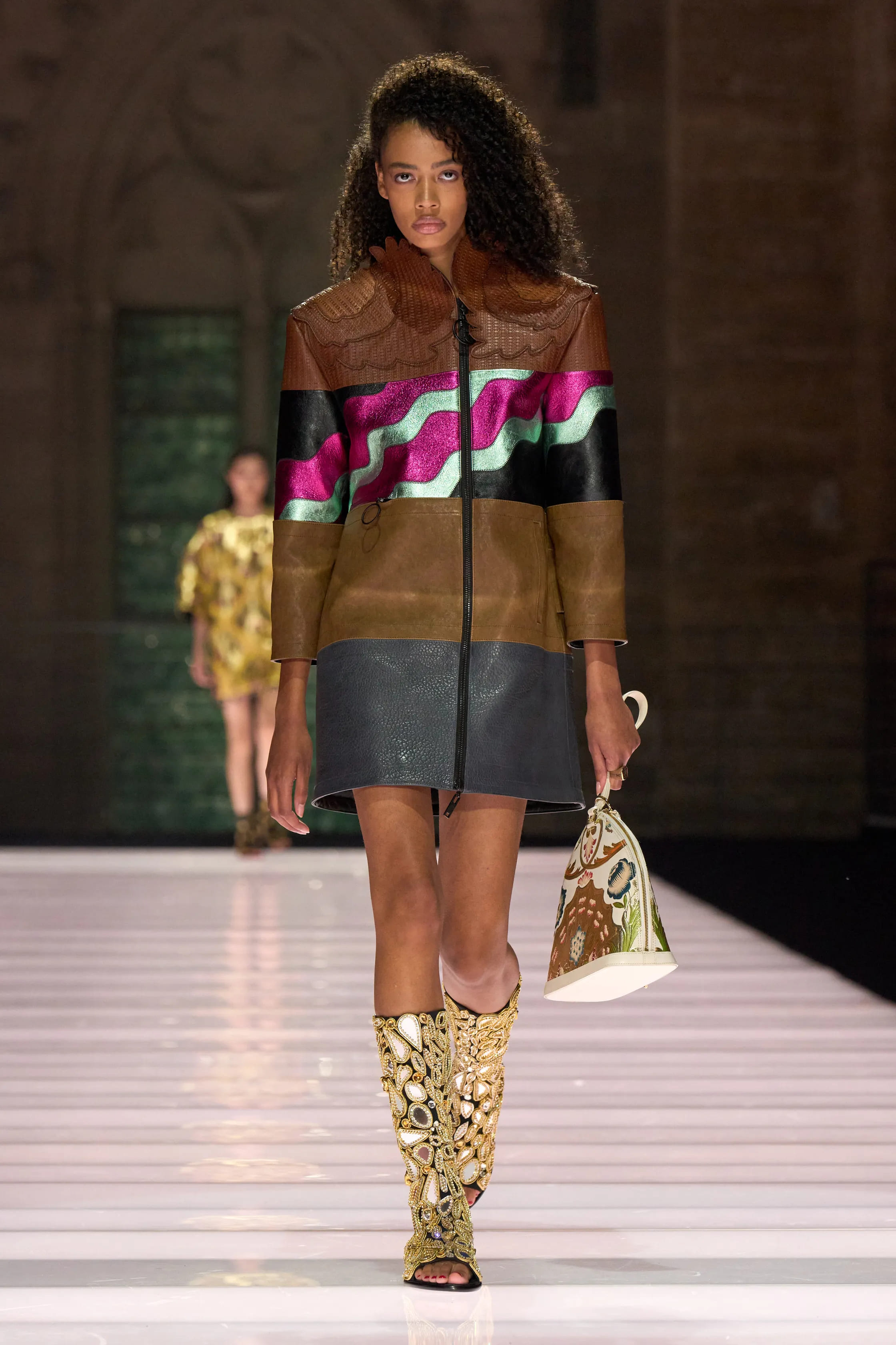 Для показу жіночої колекції Cruise 2026 Louis Vuitton на чолі з дизайнером Ніколя Жеск'єрєм вирушили в Папський палац в Авіньйоні, пам’ятку французької архітектури та об’єкт Всесвітньої спадщини ЮНЕСКО. Провідними наративами в дизайні виступили середньовічна розкіш і декадентський глем-рок, що втілювалися у скульптурних силуетах, авангардних формах, декоративних обладунках, блискітках, хутрі, кейпах, м’якій шкірі й принтах, натхненних гобеленами.