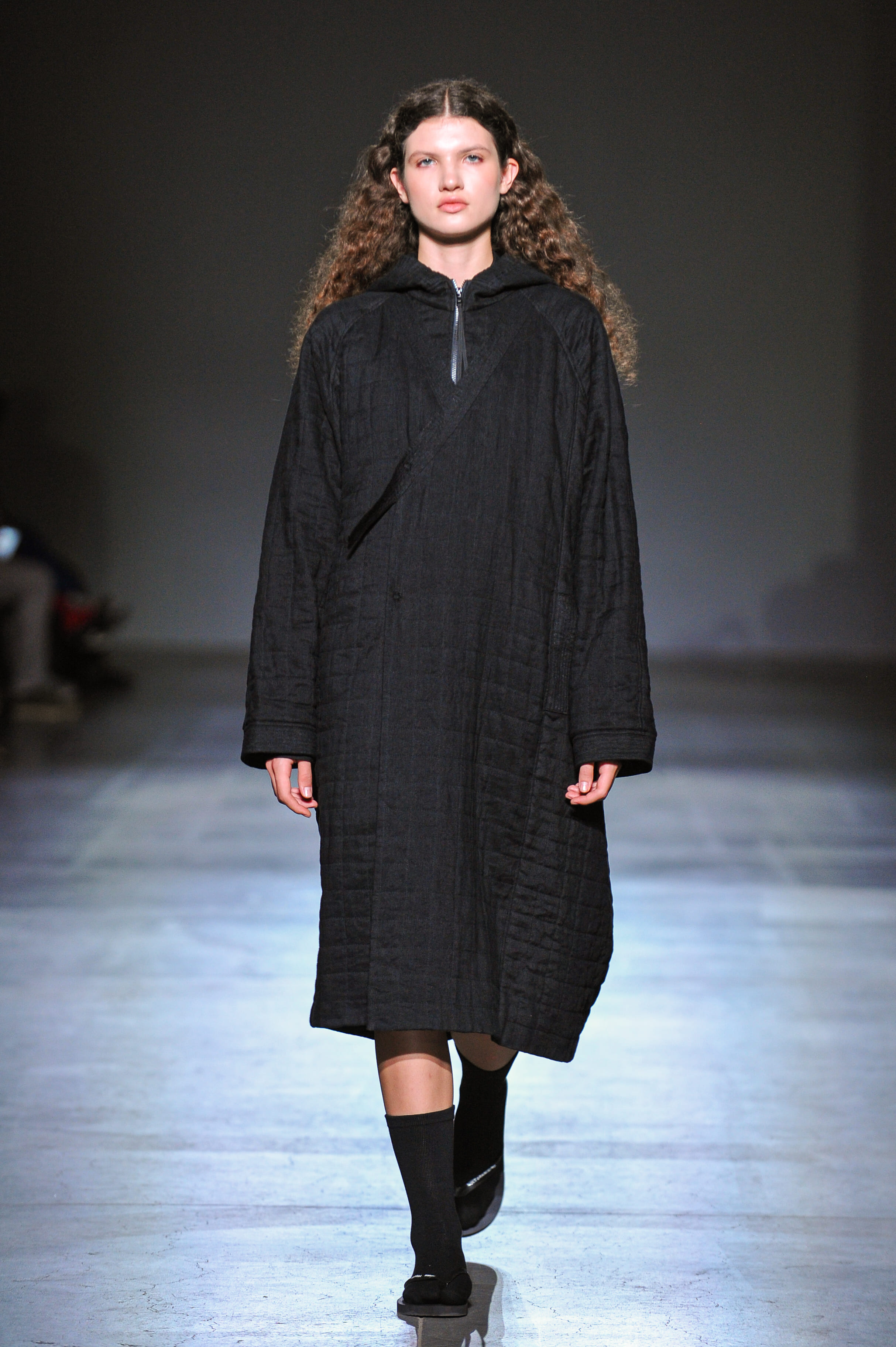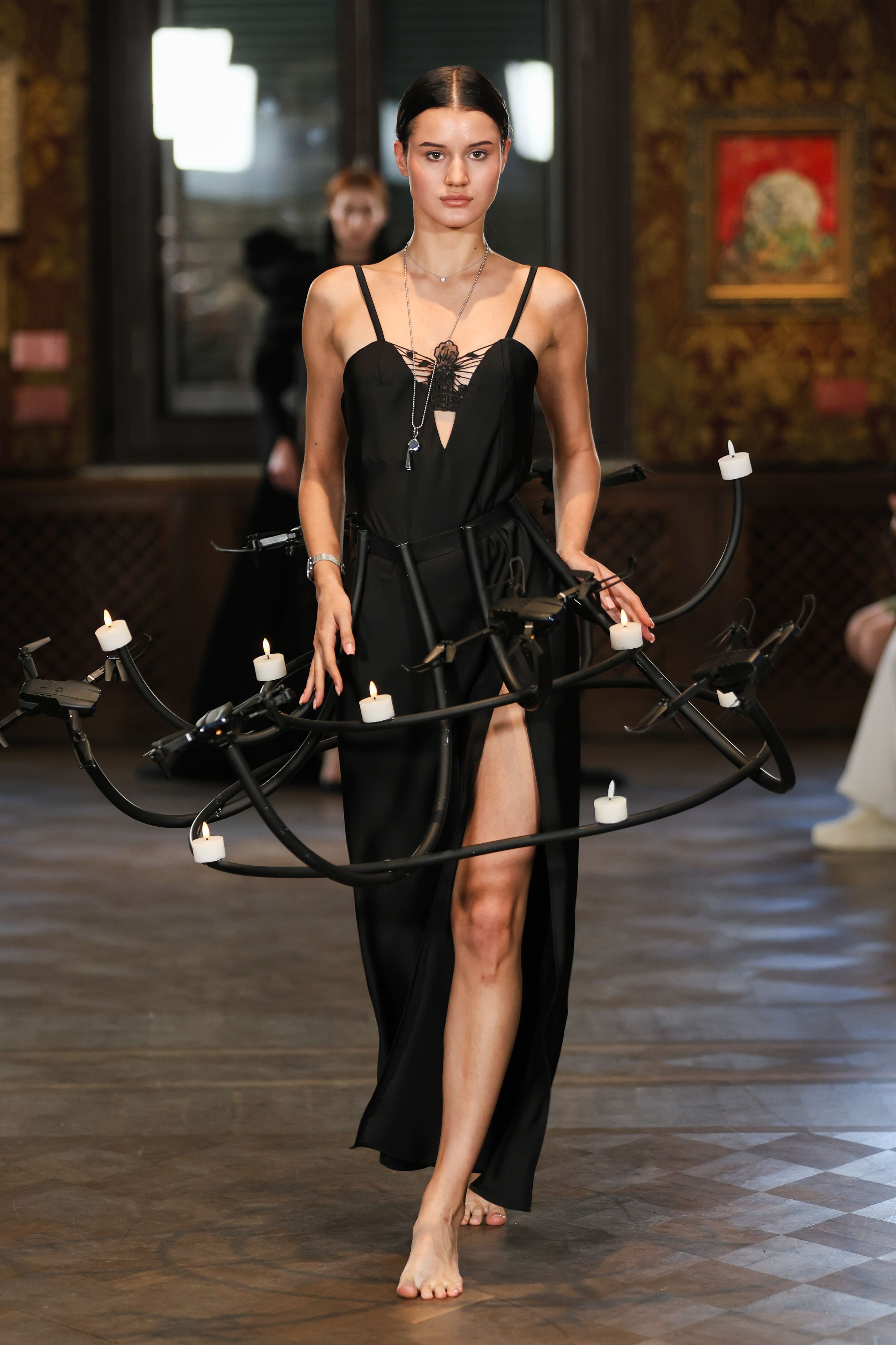 Ключовий образ — людина у чорному, що стоїть серед руїн зруйнованої будівлі. Це не драматичний жест, а тиха фіксація теперішнього стану. Чорний тут — не стилістичне рішення, а мова реальності. Попри це, колекція, яка налічує 51 образ, залишає місце для надії.