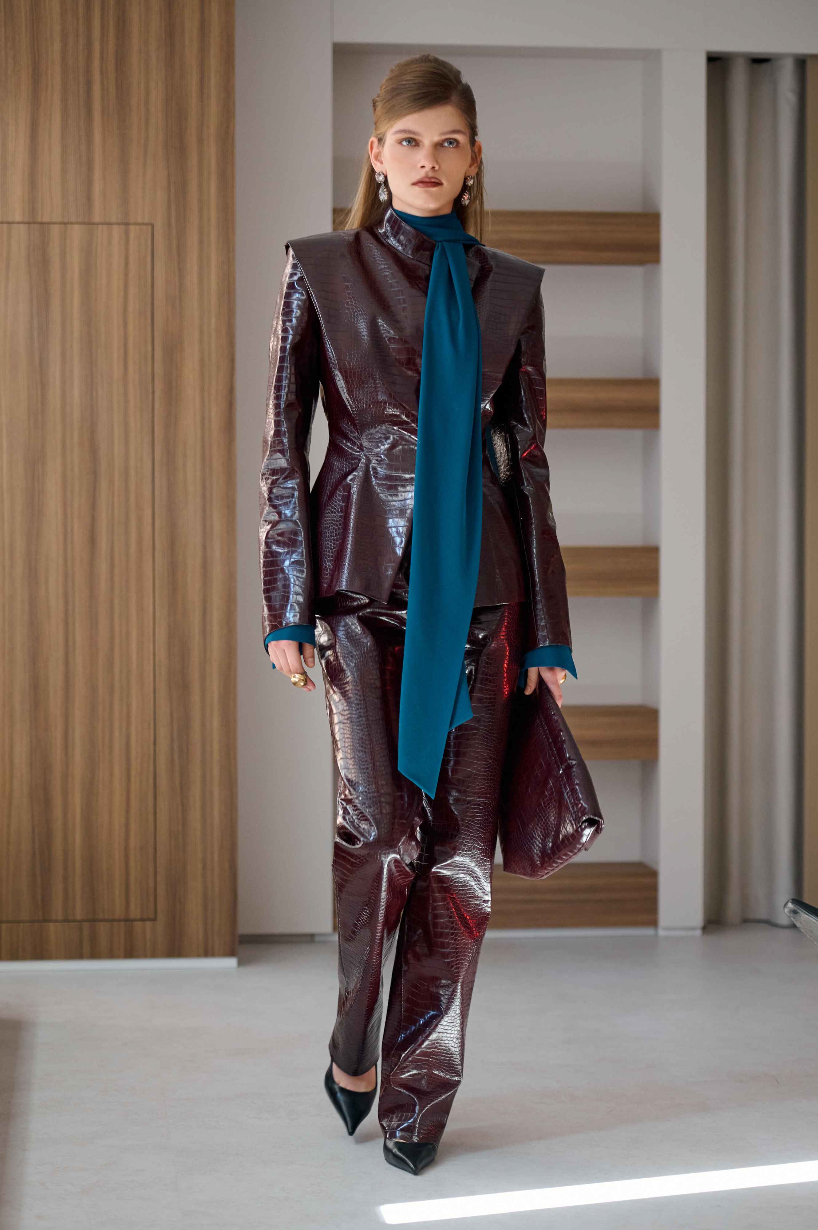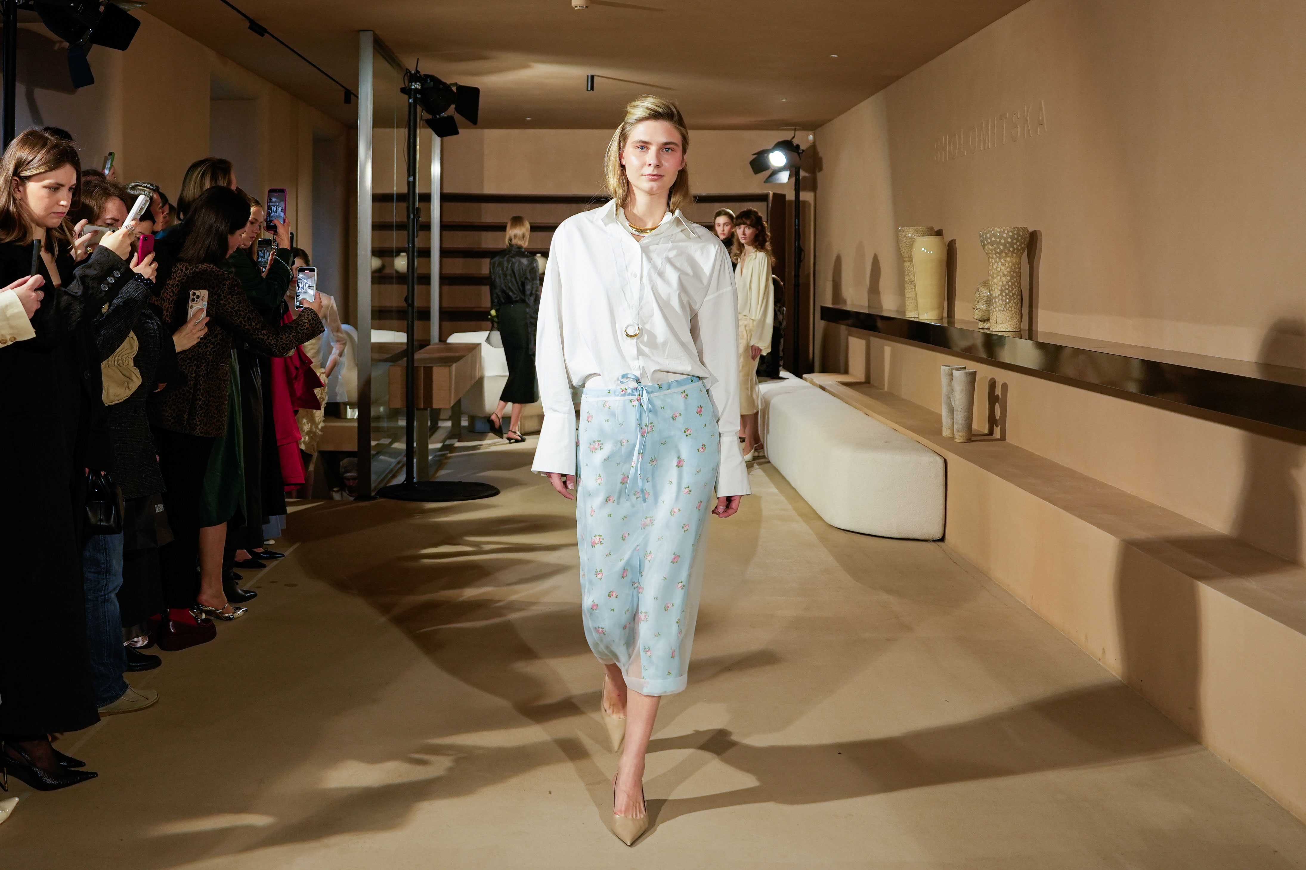 Шви з навмисно випущеними нитками проходять крізь тренчі, спідниці та сукні. Вони додають силуетам бруталізації, створюють напругу між чистотою крою та «неідеальністю» краю. І саме ця напруга формує новий характер жіночності бренду — своєрідний гранж у кольорі ice blue. Той самий прийом з’являється і у взутті, зокрема в ботфортах, які дизайнерка ховає вже не перший рік під багатошаровістю.