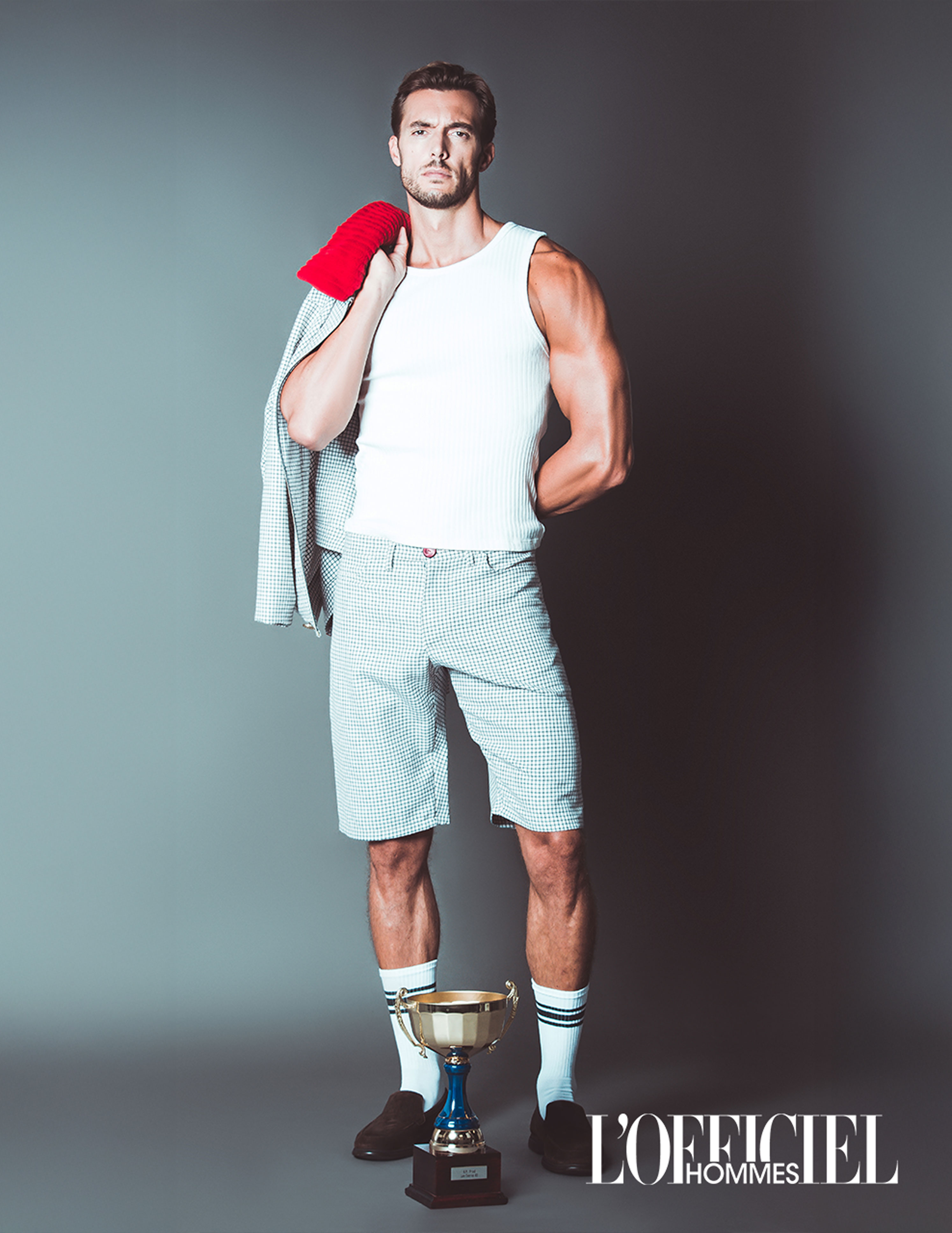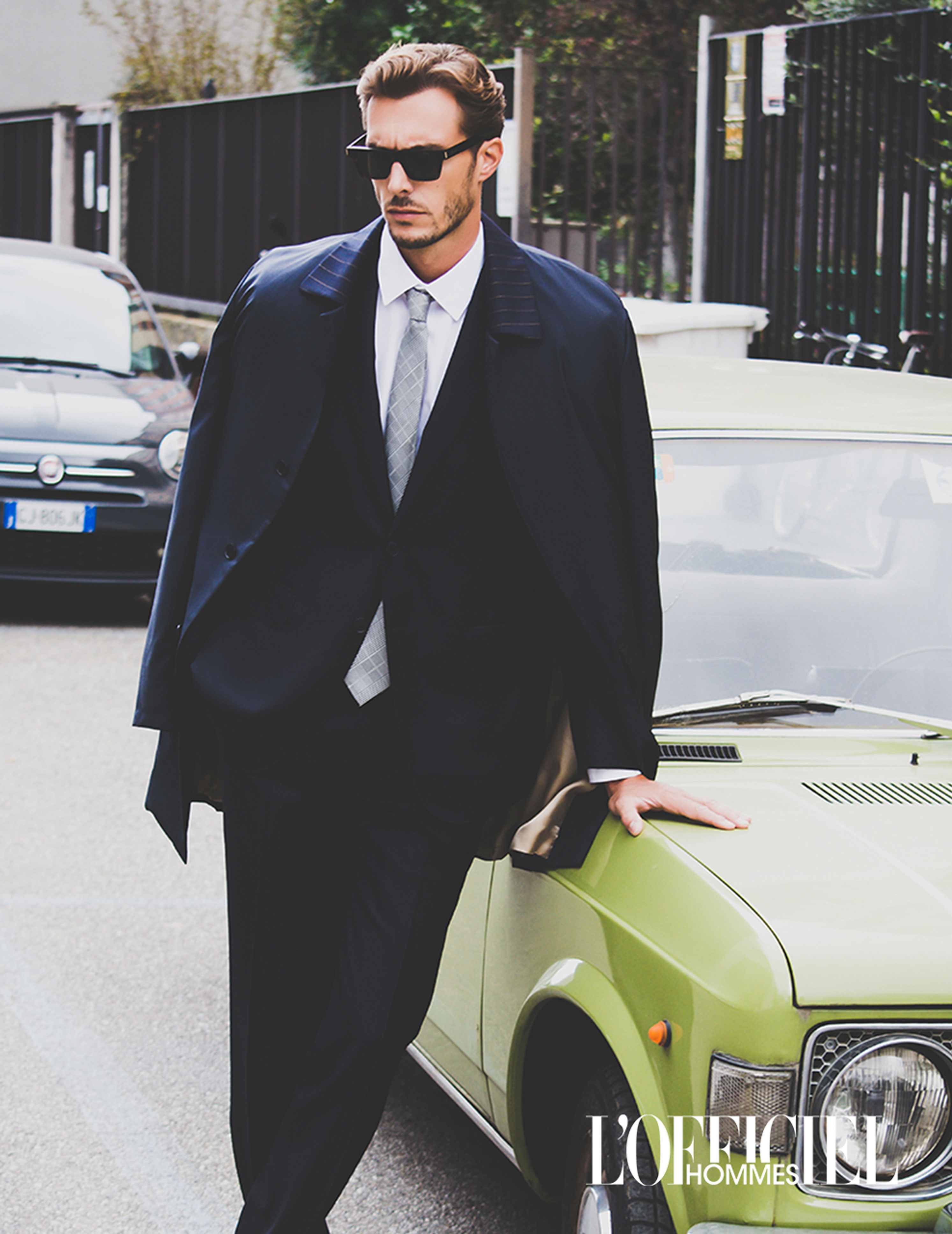 Один із образів, який приміряє наш гладіатор Федеріко, складається з синіх штанів із кремовими смужками та темно-синьої вельветової куртки-бомбера, яка стає сполучною ланкою цього знімання: це – данина традиціям, сміливо переосмислена.
