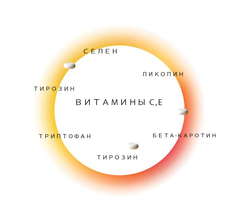 Даже если вы не принимали витамины и БАДы всю долгую зиму и весной, дожидаясь свежих фруктов и овощей, перед сезоном активной инсоляции стоит изменить свою позицию. Причем приобретать комплексные витамины не стоит – лучше обратите внимание на те, где в достаточном количестве присутствуют селен, цинк, бета-каротин, витамины С и Е, ликопин, а также аминокислоты триптофан и тирозин, которые стимулируют выработку гормона меланина и отвечают за проявление загара на коже.