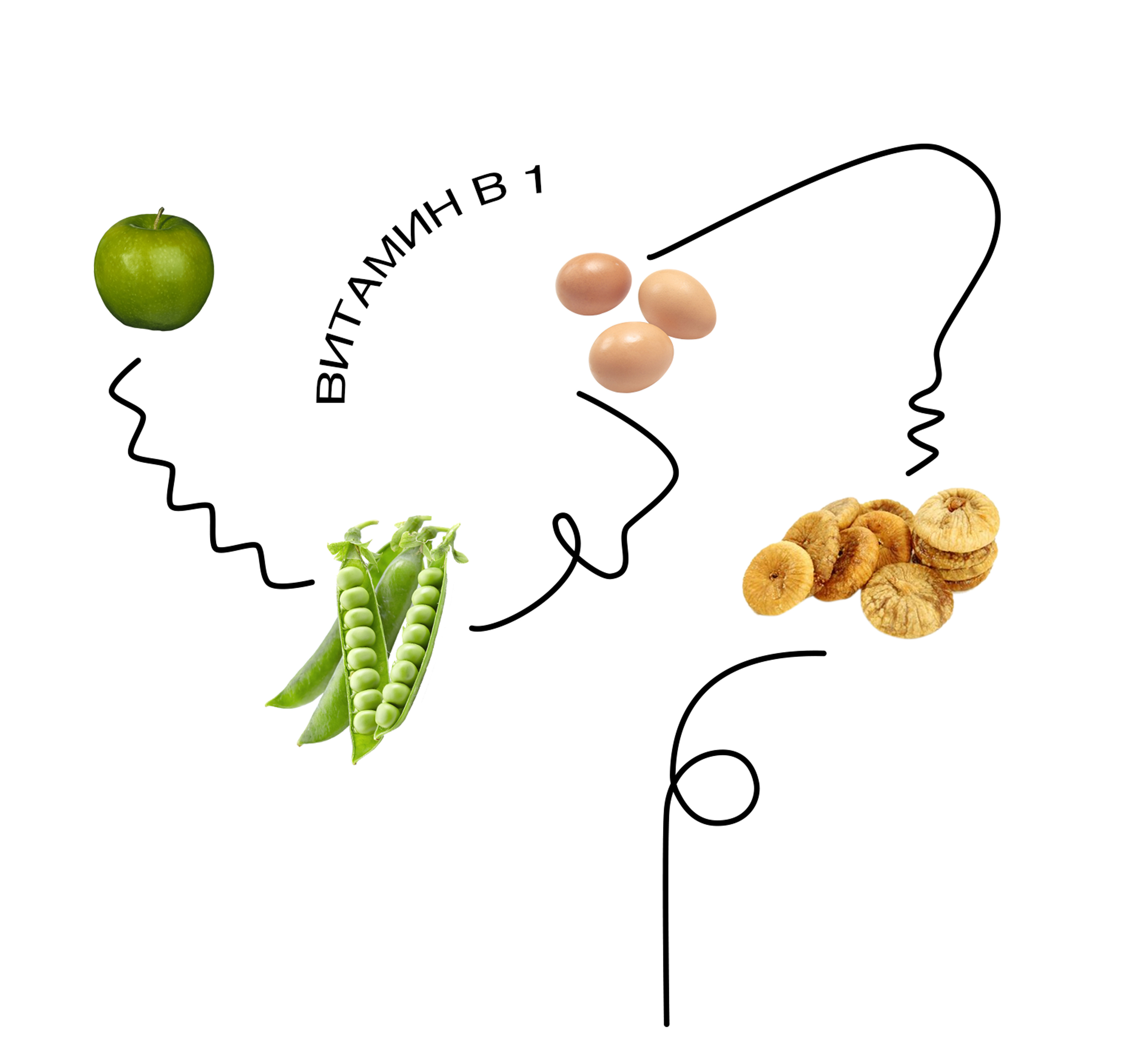 Отвечает за энергию в организме, настроение, стабильность нервной системы. Содержится в горохе, фруктах, сухофруктах, яйцах, цельнозерновых продуктах, печени. Суточная дозировка витамина В1 составляет 1 мг для мужчин и 0,8 мг для женщин (имеются в виду взрослые мужчины и женщины, от 19 лет и старше). Тиамин не накапливается в организме, поэтому нам каждый день нужно употреблять содержащие его продукты.