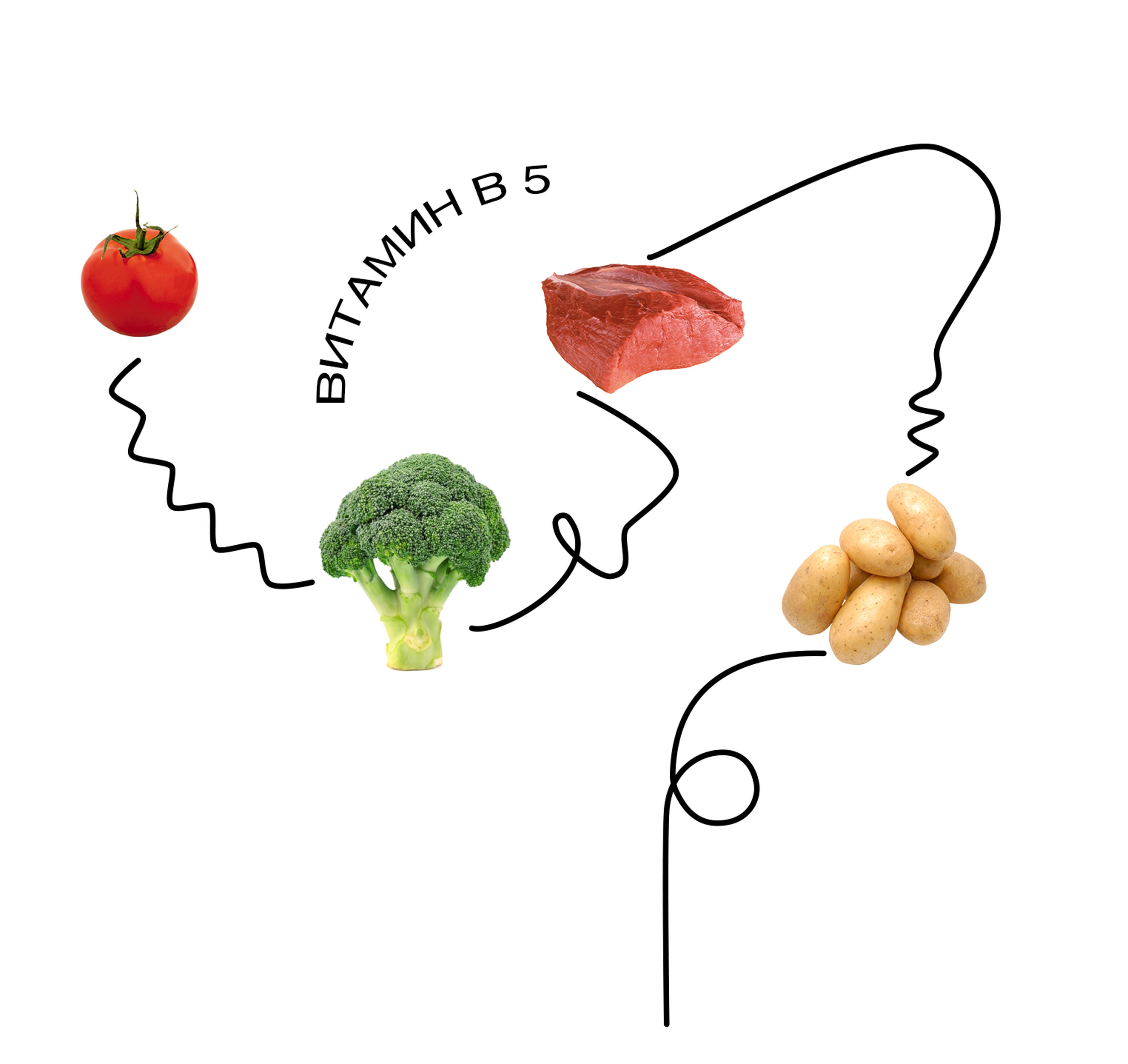 Также отвечает за нервную проводимость и энергообмен в организме. Содержится в мясе курицы, говядине, картофеле, томатах, брокколи, овсяной и других цельнозерновых кашах, диком рисе, яйцах, субпродуктах. Суточная дозировка витамина В5 составляет 5 мг.