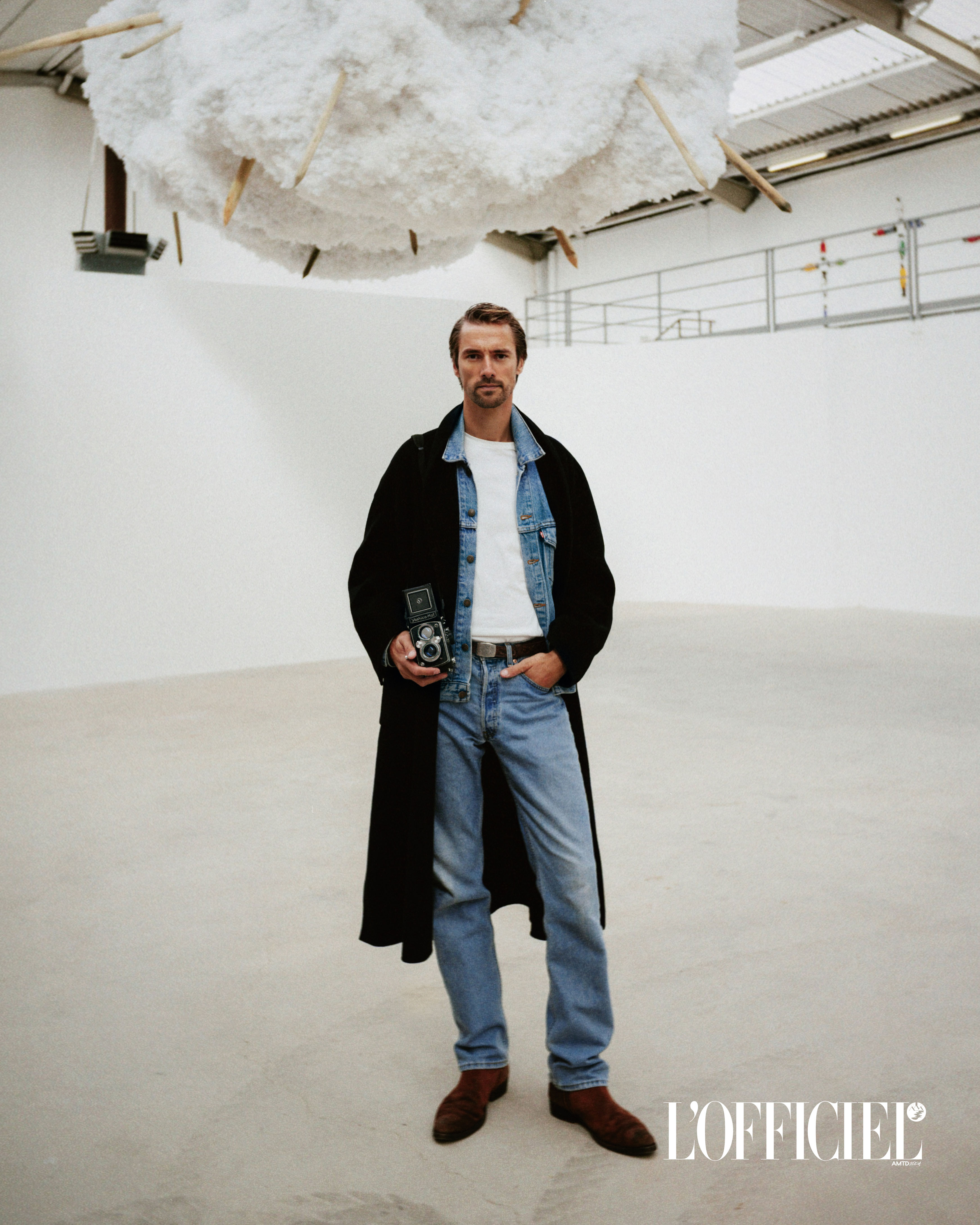 Pascale Marthine Tayou, Tch âm, exhibition views – Galleria CONTINUA, Les Moulins (C) Hafid Lhachmi – ADAGP Paris, 2025. Details: Pascale Marthine Tayou, Coton tige, 2015. Джинсова куртка, джинси, LEVI’S Футболка, OCTOBRE ÉDITIONS x AMANDINE PANDA Ремінь, RALPH LAUREN RRL Пальто, IRO Черевики, FRYE