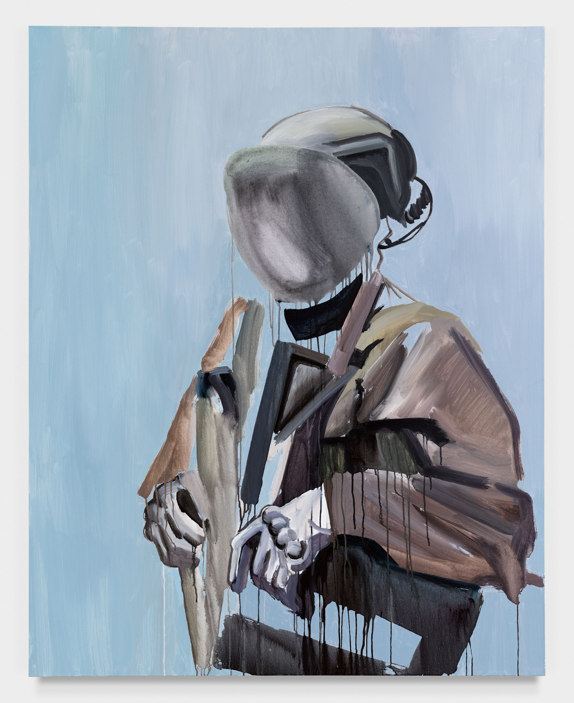 Леся Хоменко, працюючи над цією серією, зосередилася на дослідженні ролі цифрових фотографій військових у контексті війни. Як відомо, з початку повномасштабного вторгнення в Україні заборонено фотографувати військових чи будь-які військові об’єкти з міркувань безпеки. Фотофіксація перетворюється на зброю. У своїх роботах художниця використовує фотографії, що їй надсилає її чоловік-військовослужбовець: селфі українських солдатів, які вони самі ретушують за допомогою глітчу, пікселізації, розмиття або штрихування, щоб замаскувати обличчя та зброю. Перекладаючи з фотографічної на мову живопису, Леся включає ретушовані фрагменти у фігури персонажів. Усування стратегічної інформації нашаровує додаткові сенси. На картині, яку ми розглядаємо, знеособлення персонажу мало би утворювати дегуманізуючий ефект. Але оригінальне поєднання в портреті фігуративності й абстракції та монументальність образотворчості авторки не позбавляє персонажа людських якостей, а наділяє надлюдськими.