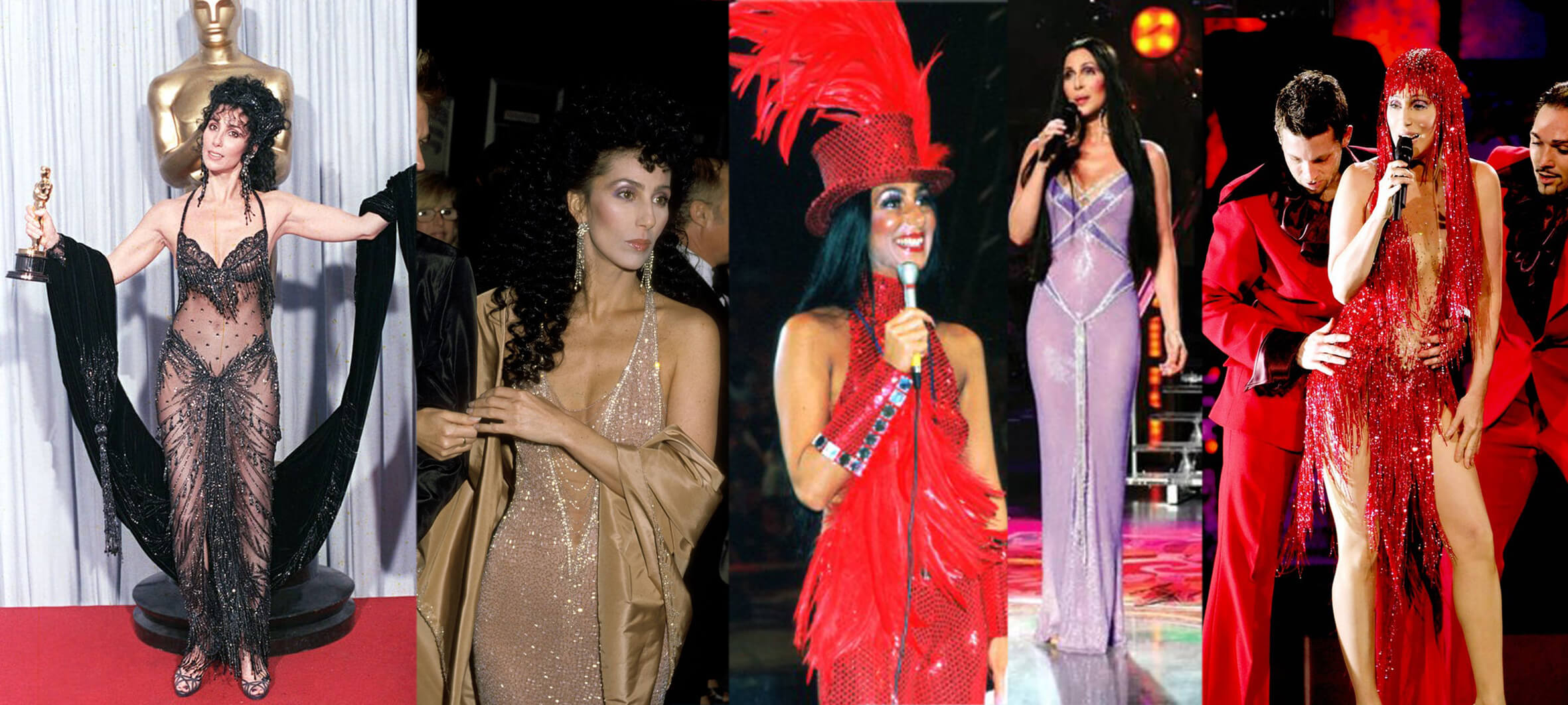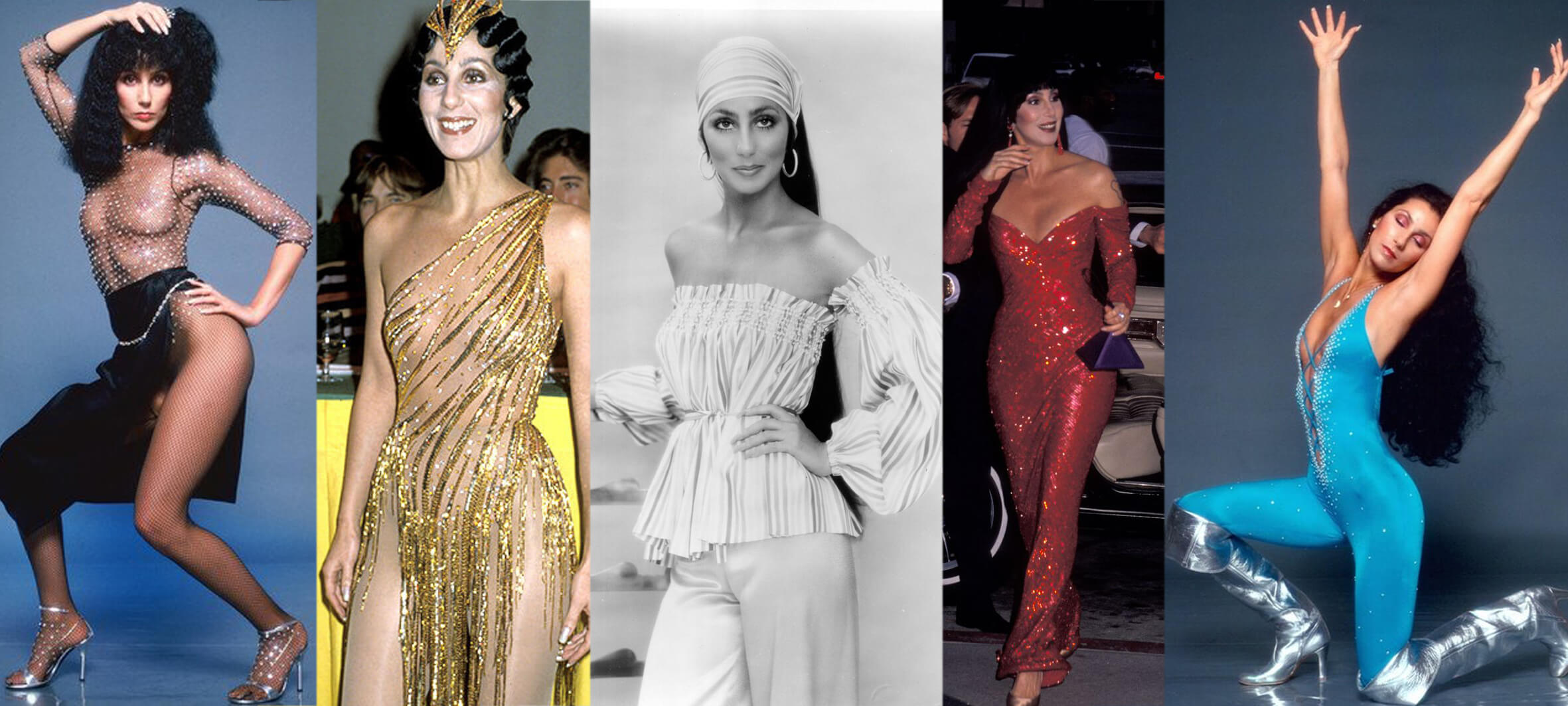 Шер — это всегда праздник. Целый вихрь из романтизма, хиппи-шика и гламурной соблазнительности умещается в этой женщине вот уже на протяжении нескольких десятилетий. В 1970-х артистка любила наряды дизайнера Боба Маки, носила прозрачные платья в духе 30-х, платья из перьев, миллионы страз и кружев и струящиеся наряды из шелка.