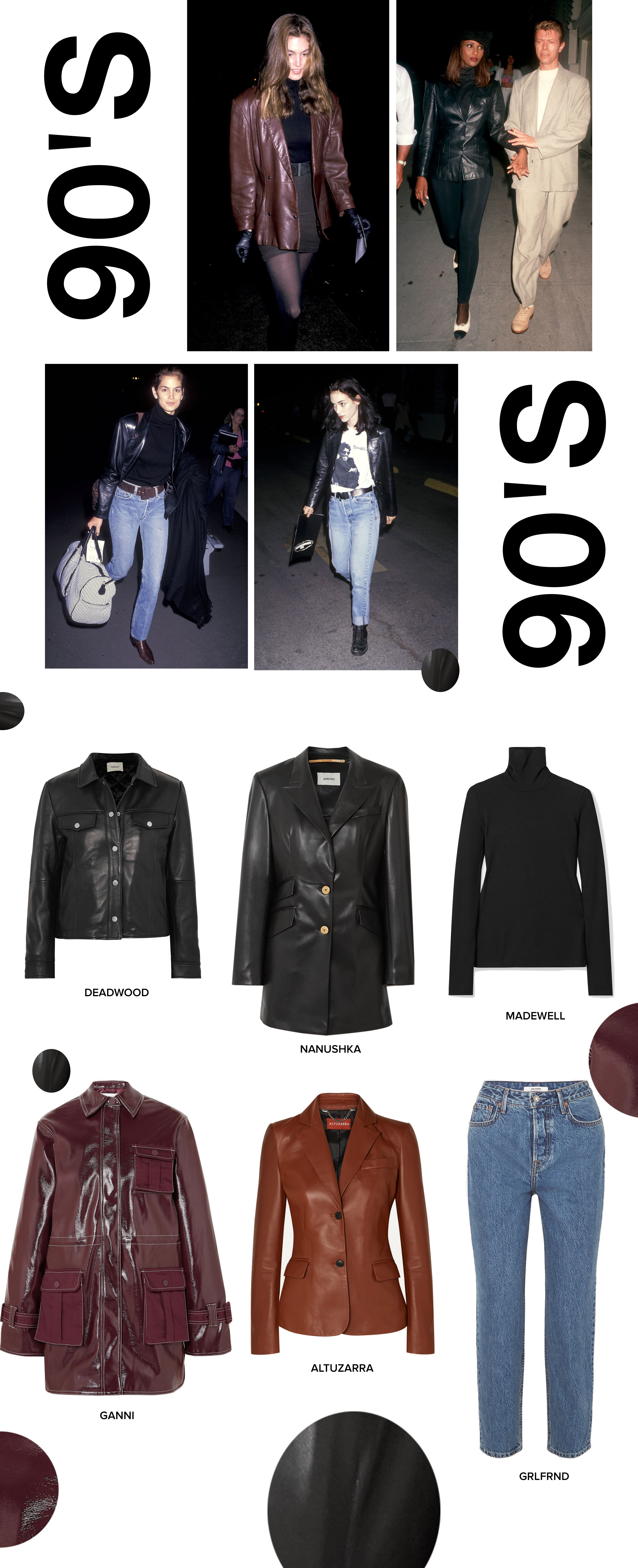 Черпать вдохновение из 90-х можно долго и неустанно. Лоск и лёгкость, с которыми супермодели и актрисы щеголяли в угловатых костюмах, трикотажных мини и цветных шубах, восхищают. Тут же появляется желание устроить игру в переодевания и отправиться на вечеринку. Однако и в повседневности многие стилистические приёмы можно применить удачно, составив эффектный и комфортный образ. Наш выбор — супермодели Иман и Синди Кроуфорд и актриса Вайнона Райдер в свободных кожаных пиджаках.