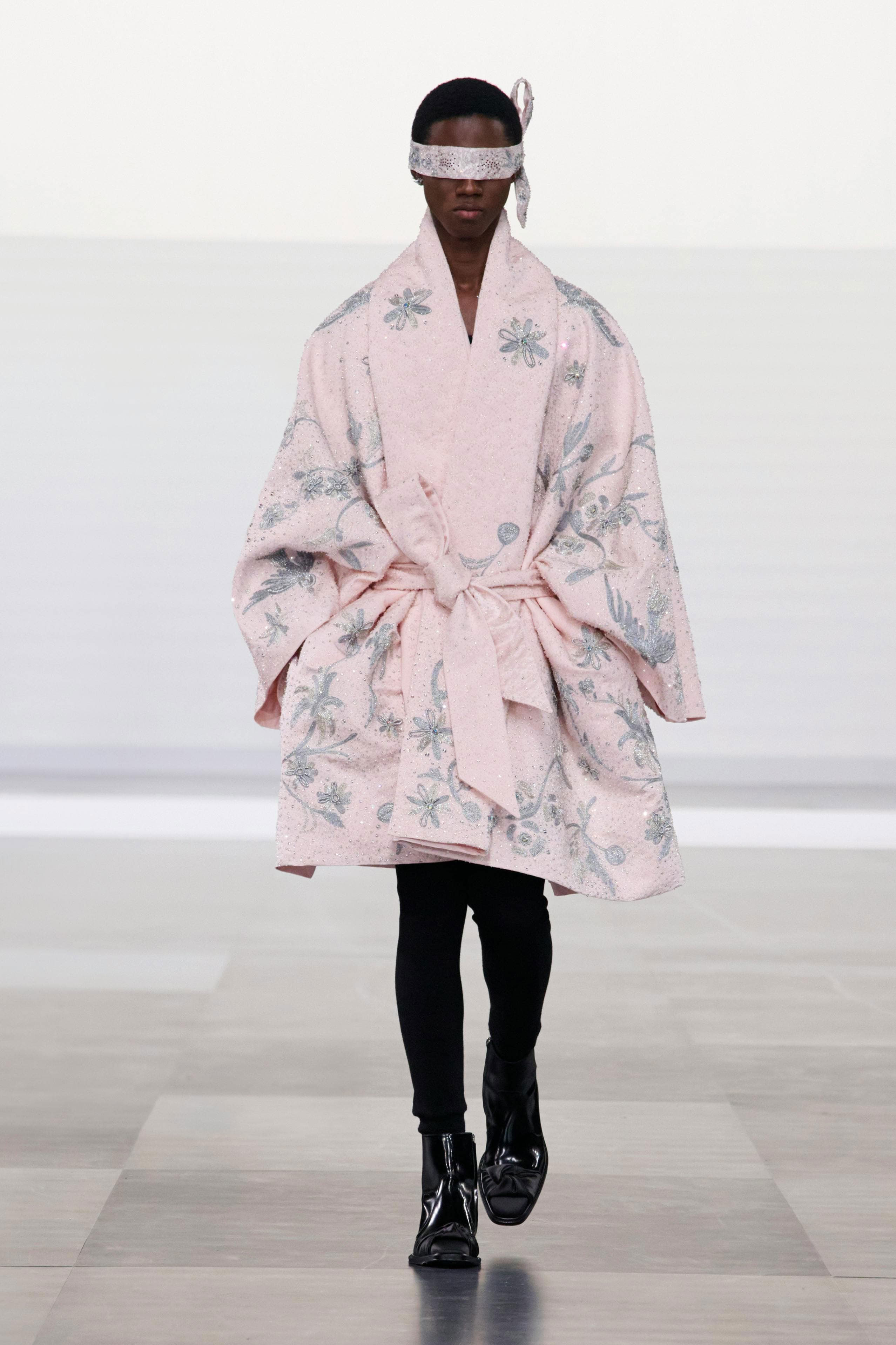 Фінальний образ – рожеве пальто-кімоно, майстерно розшите бісером (відсилання до жакета Pondichéry з кутюрної колекції 1948 року). Колекція FW 2025/2026 показує, якою вишуканою може бути чоловіча мода в наш час. «Настав час імпортувати цінності haute couture в чоловічий одяг», – із цими словами Кім Джонс вступав на посаду креативного директора Dior. У своїй останній колекції, сім років потому, він цю обіцянку виконав.