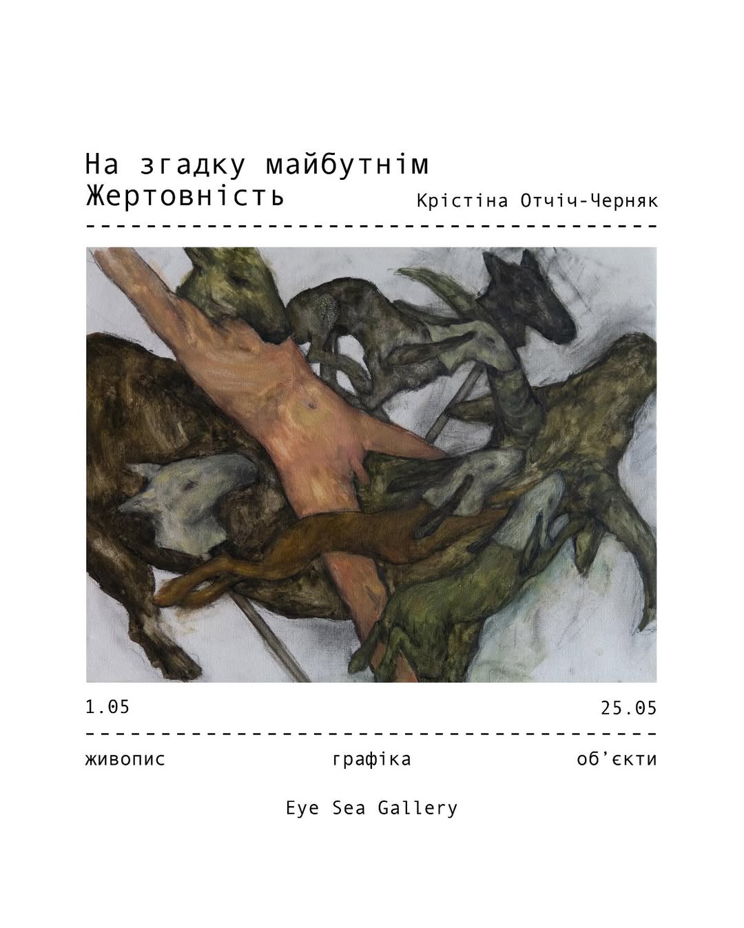 У межах нової персональної виставки графіки художниця представляє три історії. Перша — про мир після війни: чи дає він якесь прощення, чи скасовує всі жертви, чи анулює всі кроки відваги? Друга — про споживацтво як нову релігію, епоху під назвою консюмеризм: чи відчуваємо ми відповідальність за примусовий забій, вирощування тварин? Третя — про релігію та неусвідомлене слідування їй. «Я не вірую, та пам’ятаю, коли треба вшанувати, згадати жертву релігії своєї нації», — ділиться мисткиня.