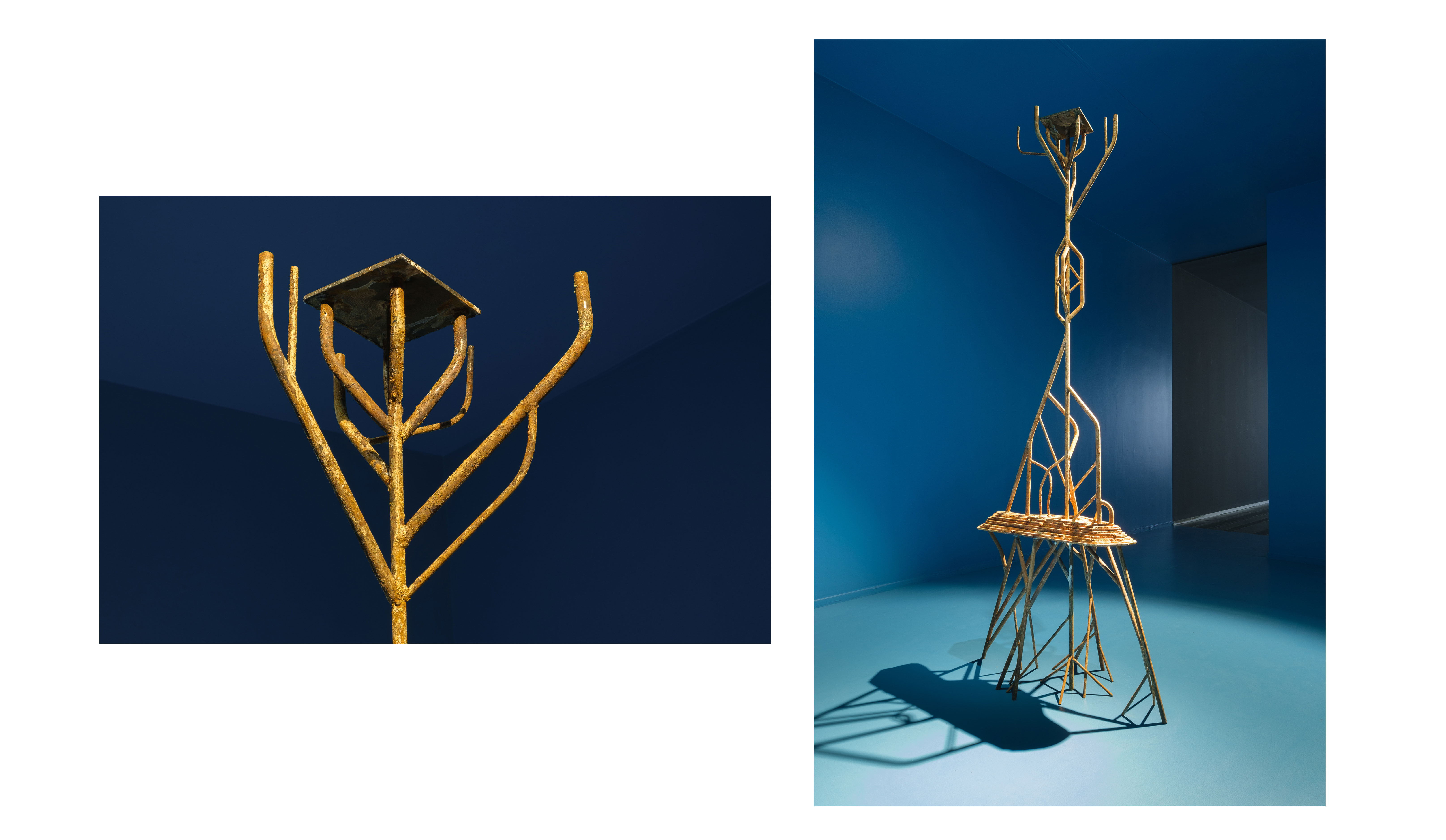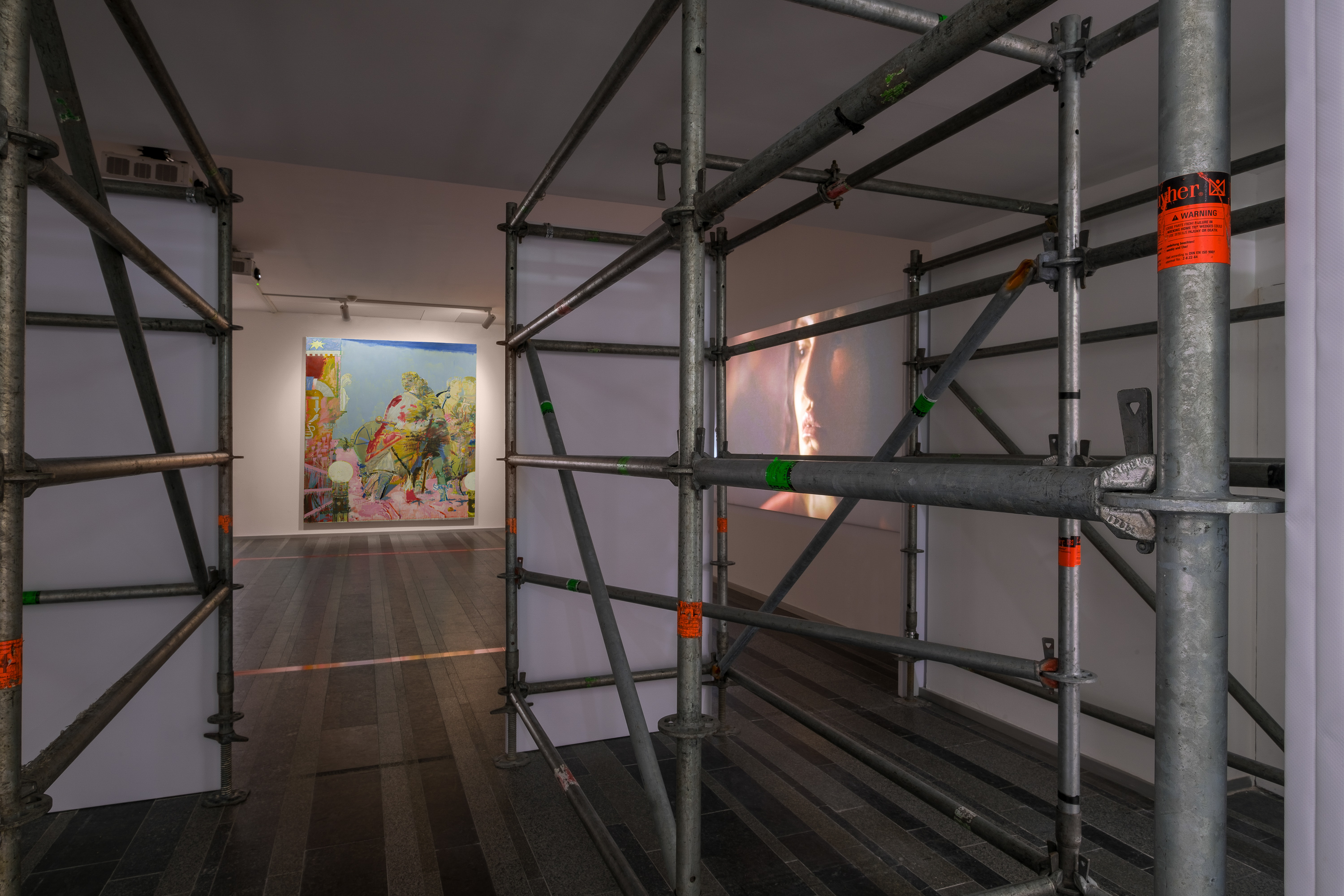 Металлическая решетка на полу — это реди-мейд и работа Никиты Кадана “Победа над солнцем”. Эта широко распространенная в бывшем советском пространстве оконная решетка с изображением восходящего солнца — символ лучезарного будущего советского строя. Размещавшаяся на окнах детсадов, больниц, общественных зданий, решетка выполняла охранно-репрессивную функцию, карикатурно резонирующую с образом солнца.