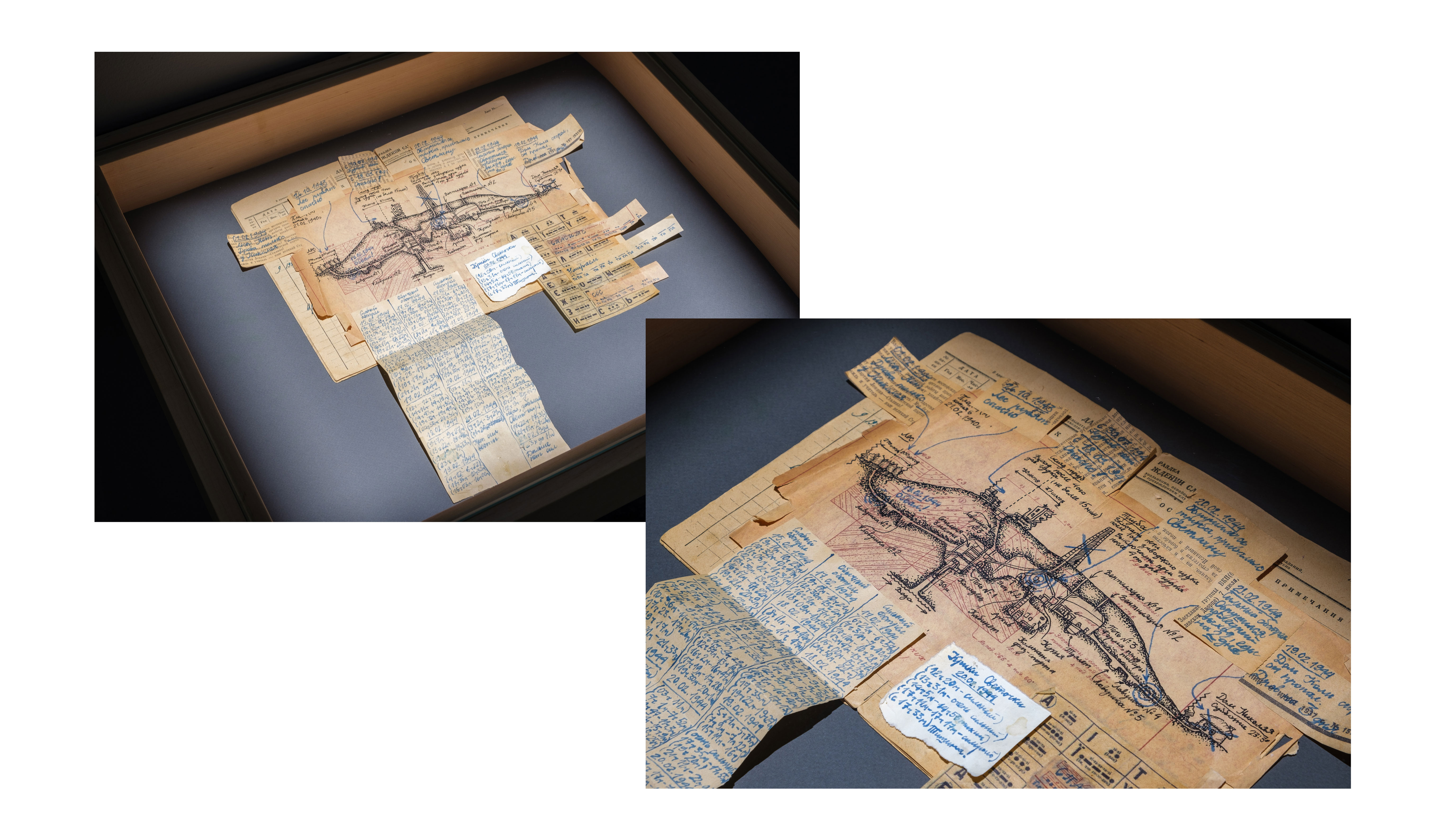 Экспонаты музея относятся к разным периодам истории. Артефакт из бумаги соответствует 1937-44 годам. Это дневник заместителя руководителя металлургическо-обогатительного комбината «Криворожсталь», который по невыясненным причинам прятался с семьей в месте будущего хвостохранилища. В дневнике содержится архив звуков, которые хозяин тайника тщательно документировал. Также он вел запись сообщений, которые отправлял наружу с помощью азбуки Морзе.