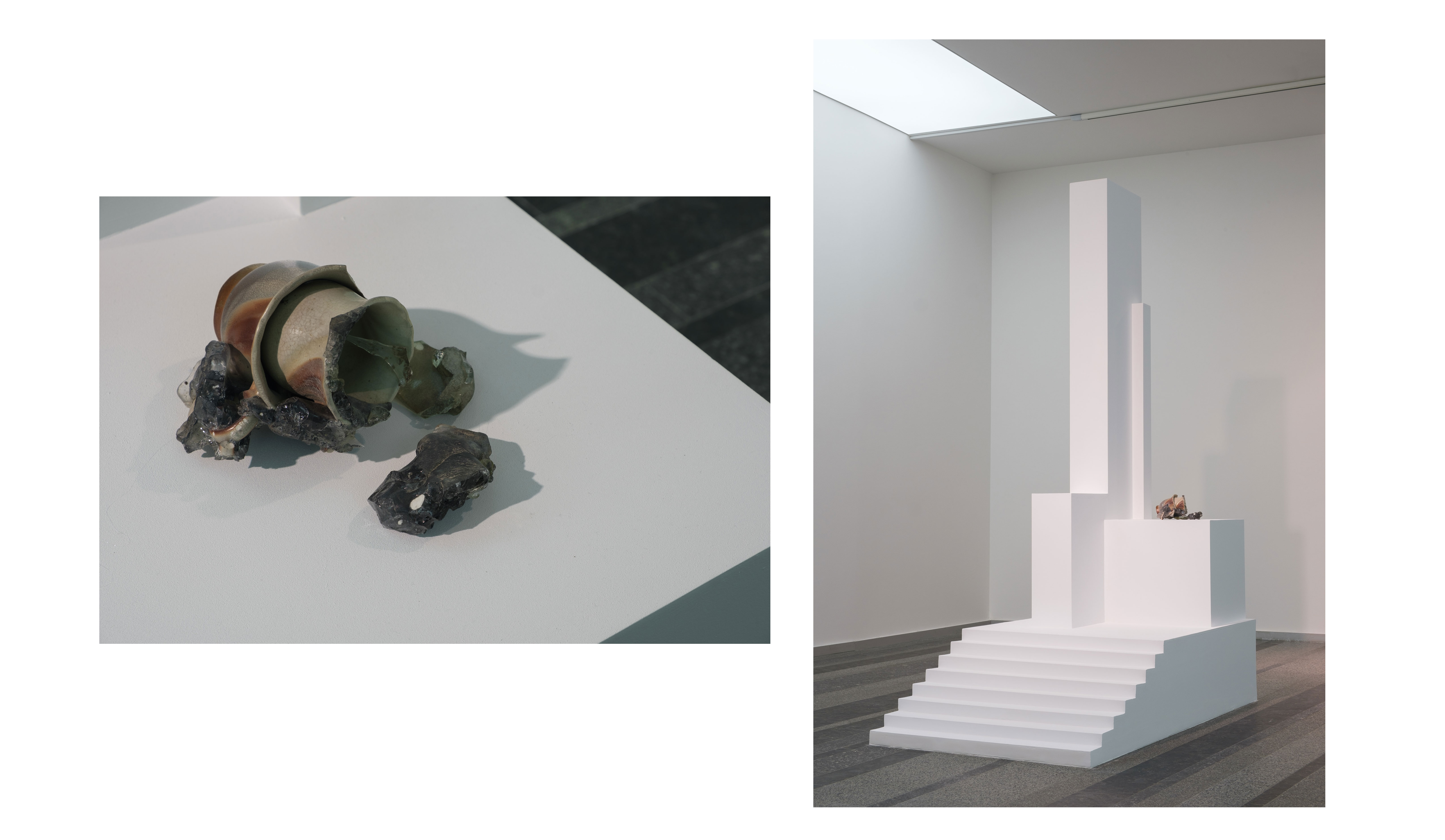 Расплавленная чашка в экспозиции выставки “Камень бьет камень” является частью инсталляции “Победа”. Чашка расположена на реконструкции модели “Памятника трем революциям: 1825, 1905, и 1917 гг.” харьковского художника-авангардиста Василия Ермилова. В отличие от оригинальной работы Ермилова, постамент Кадана обесцвечен. Он полностью покрыт белой краской, что создает ощущение стерильности. Он как бы очищен от конкретики реального мира и воплощает в себе чистую утопическую идею революции. В противовес ему чашка — реальный артефакт войны на востоке Украины, найденный Никитой в одном из разрушенных домов прифронтового Донбасса, пострадавших при артиллерийских обстрелах. Трагическая образность чашки, обуглившейся в огне войны, контрастирует с непорочной идеальностью революционной утопии, воплощаемой постаментом. Это противопоставление напоминает нам о том, что обратной стороной утопии нередко является вполне реальное и осязаемое насилие.