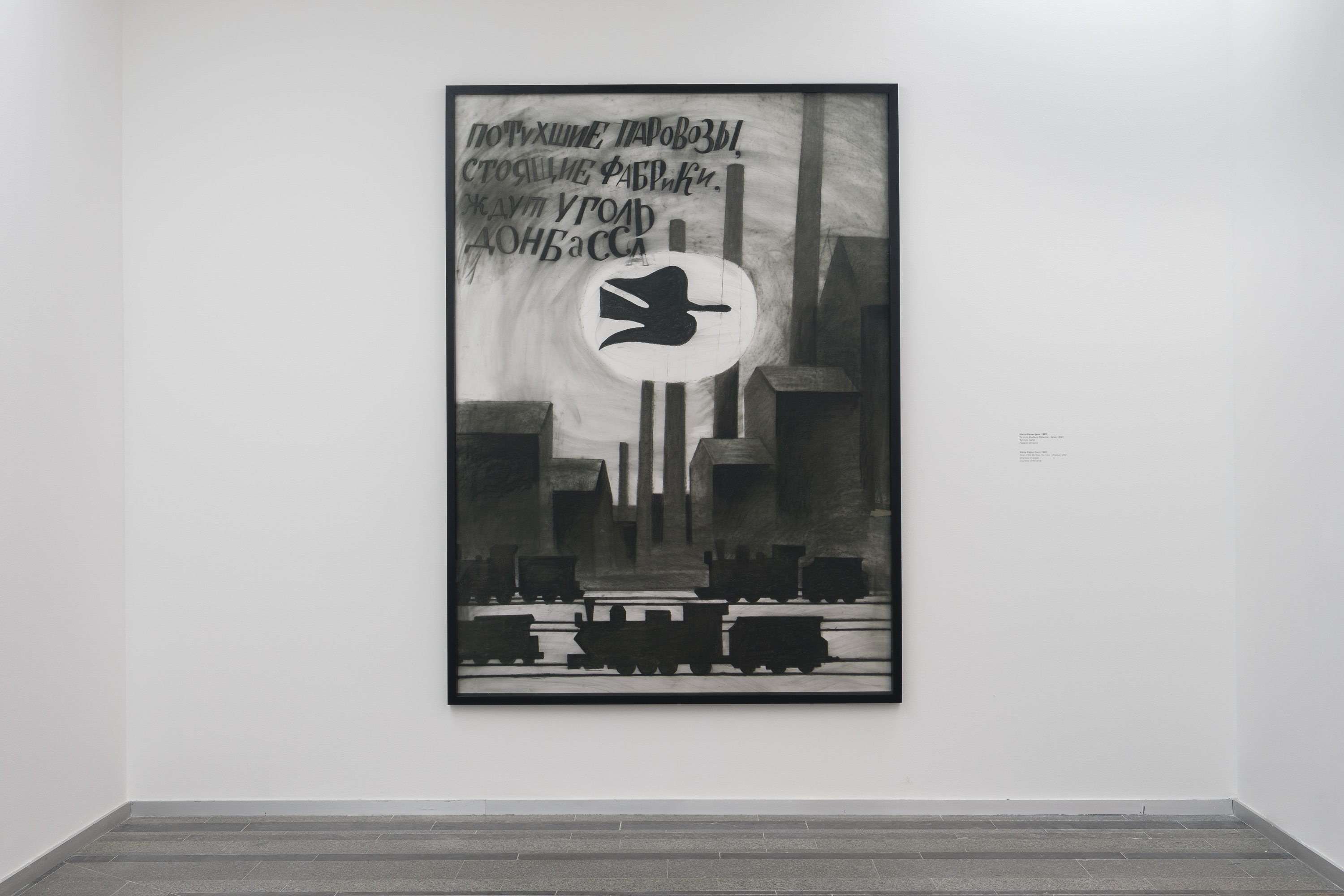 Рисунок "Уголь Донбасса (Василий Ермилов — Жорж Брак)" Никиты Кадана является своеобразным монтажом двух произведений искусства модернизма: плаката художника Василия Ермилова “Потухшие паровозы, стоящие фабрики ждут уголь Донбасса” (1920) и работы “Птица в листве” (1961) одного из основателей кубизма — Жоржа Брака. Черная птица является одним из лейтмотивов в работах Брака. В процитированном произведении черный силуэт птицы изображен на фоне газетных листов того времени, будто тень, парящая над современностью. Вероятно, черная птица Брака является его пессимистичной репликой в ответ на “Голубя мира” Пабло Пикассо (1949). Мир, обретенный после войны, отнюдь не является безоблачным, но полнится своими проблемами и страхами, тенью новых или нерешенных старых конфликтов и в то же время надеждами. В своем высказывании Никита Кадан соединяет два произведения, связанные как с переломными моментами истории, так и с контекстом современности. Сквозь призму опыта войны на Донбассе образы истории обретают дополнительный смысл. В то же время история, как черная птица Брака, отбрасывает свою тень на события, происходящие здесь и сейчас, и на наше понимание этих событий.