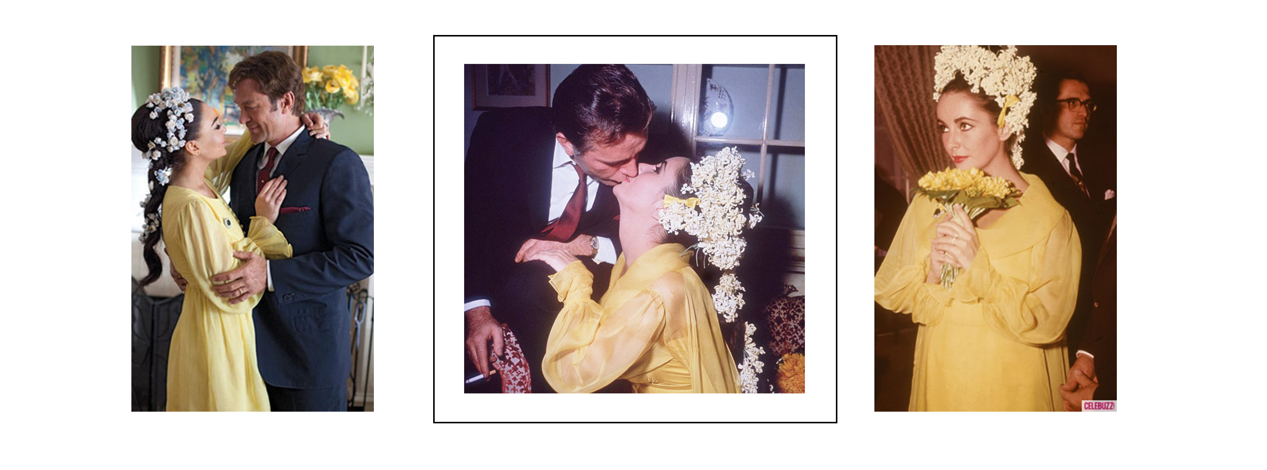 Бракосочетание Элизабет Тейлор и Ричарда Бертона прошло в Монреале. Невеста в 5-й раз надела свадебный наряд: это было желтое платье из шифона дизайна Ирен Шарафф, а волосы актрисы были усеяны гиацинтами и лилиями. Бертон же выглядел немного помято и очень нервничал во время церемонии. Может, потому, что Тейлор опоздала на роспись, а может, потому, что он слегка перебрал алкоголя. Кстати, проблемы с выпивкой преследовали актера до конца его дней.