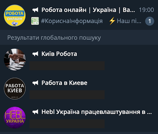 Стали дуже актуальними під час війни. Деякі мають десятки тисяч читачів. Навіть в невеликих каналах з 1 000+ підписників є класні спеціалісти. Щоб знайти подібні ресурси, використовуйте пошук. Вводьте ключові слова: “вакансії”, “робота”, “фріланс” і т. д.: