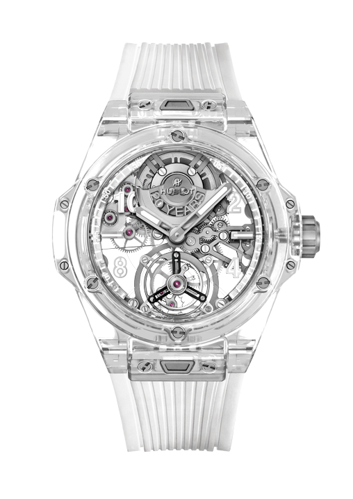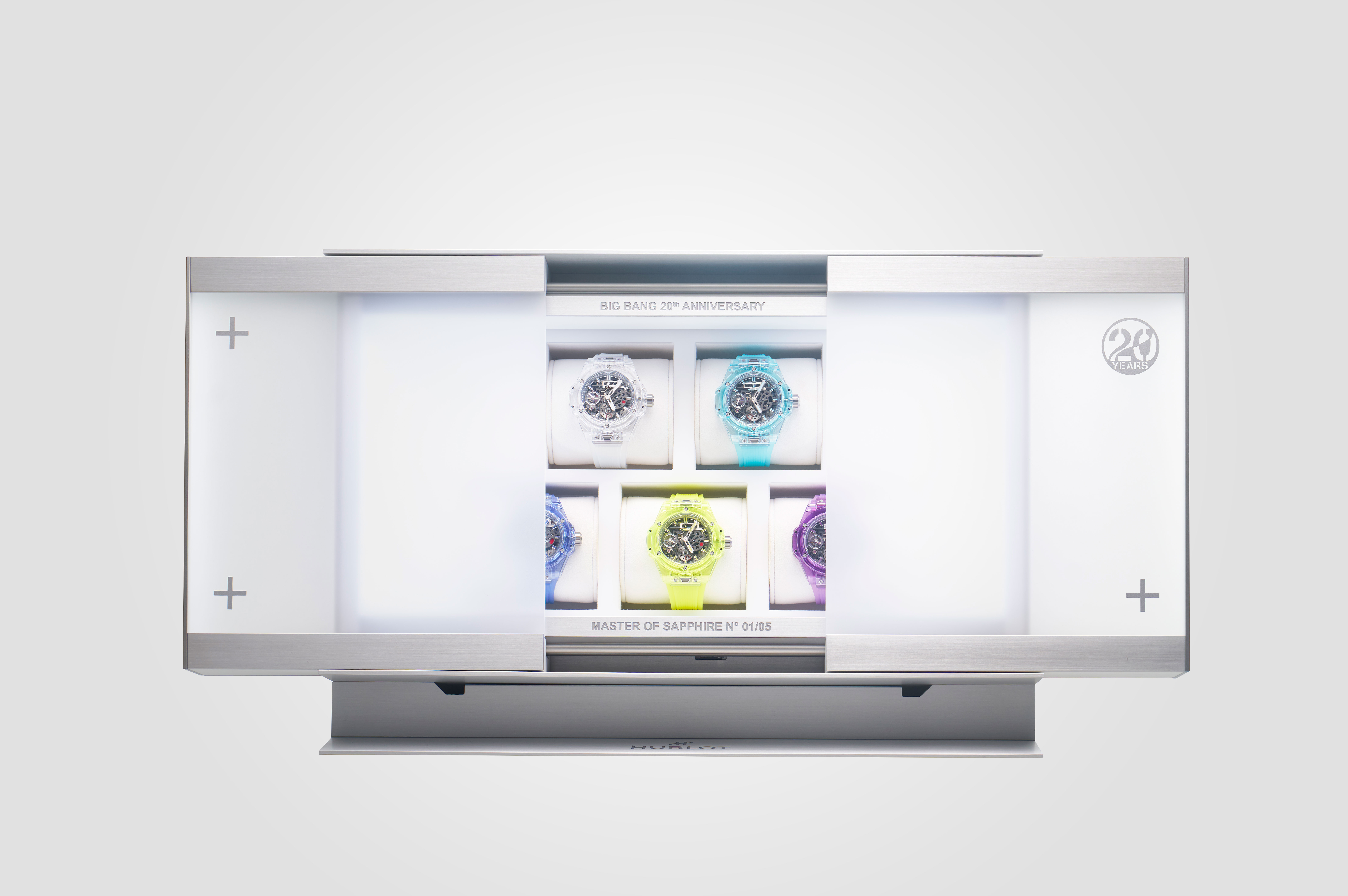 Починаючи з першої моделі Big Bang із сапфірового скла у 2016 році, Hublot поставив собі за мету досліджувати та розкривати потенціал сапфіру в усіх його можливих проявах. До свого ювілею мануфактура випустила набір із п’яти моделей з корпусами з кольорового сапфіру та SAXEM. Уперше механізм MECA-10 представлений у повністю прозорій архітектурі. Кожна з моделей має корпус діаметром 44 мм, виготовлений із прозорого, водяного блакитного, глибокого синього, пурпурного сапфіру або неоново-жовтого SAXEM.