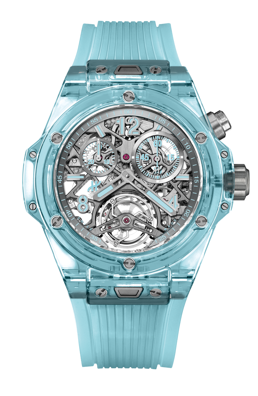 Tourbillon Automatic Sapphire — повністю прозорий корпус із сапфіру, механізм HUB6035 із мікроротором із білого золота. Red Magic — аналогічна конфігурація в червоній кераміці. Water Blue Sapphire — монопушер-хронограф із ручним заведенням та 115-годинним запасом ходу. Cathedral Minute Repeater — турбійон і хвилинний репетир із корпусом із матового вуглецю. Blue Texalium — унікальний корпус і браслет із карбонового композиту з інтенсивним синім тоном, з інтегрованим репетиром.