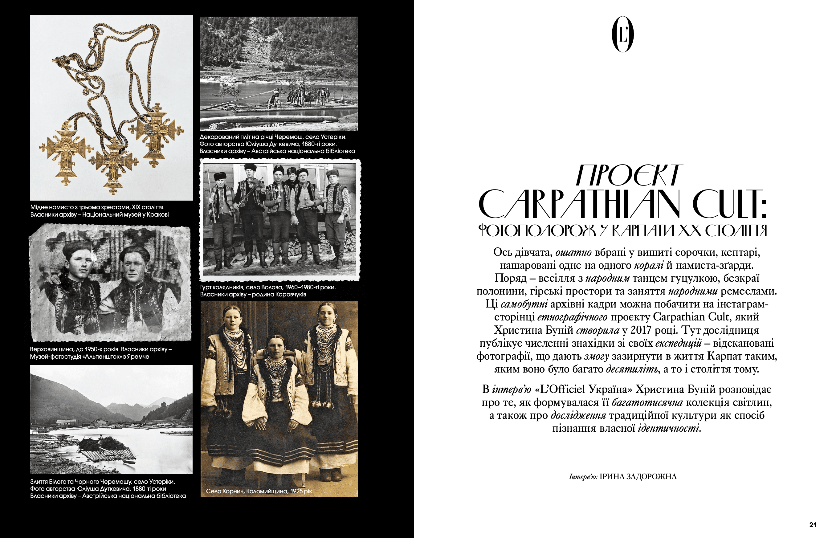 Проєкт Carpathian Cult, через експедиції та дослідження, дає нам нагоду поглянути на життя Карпат багато десятиліть тому, являючи собою своєрідну машину часу. В інтерв’ю «L’Officiel Україна» Христина Буній розповідає про те, як формувалася її багатотисячна колекція світлин, а також про дослідження традиційної культури як спосіб пізнання власної ідентичності.