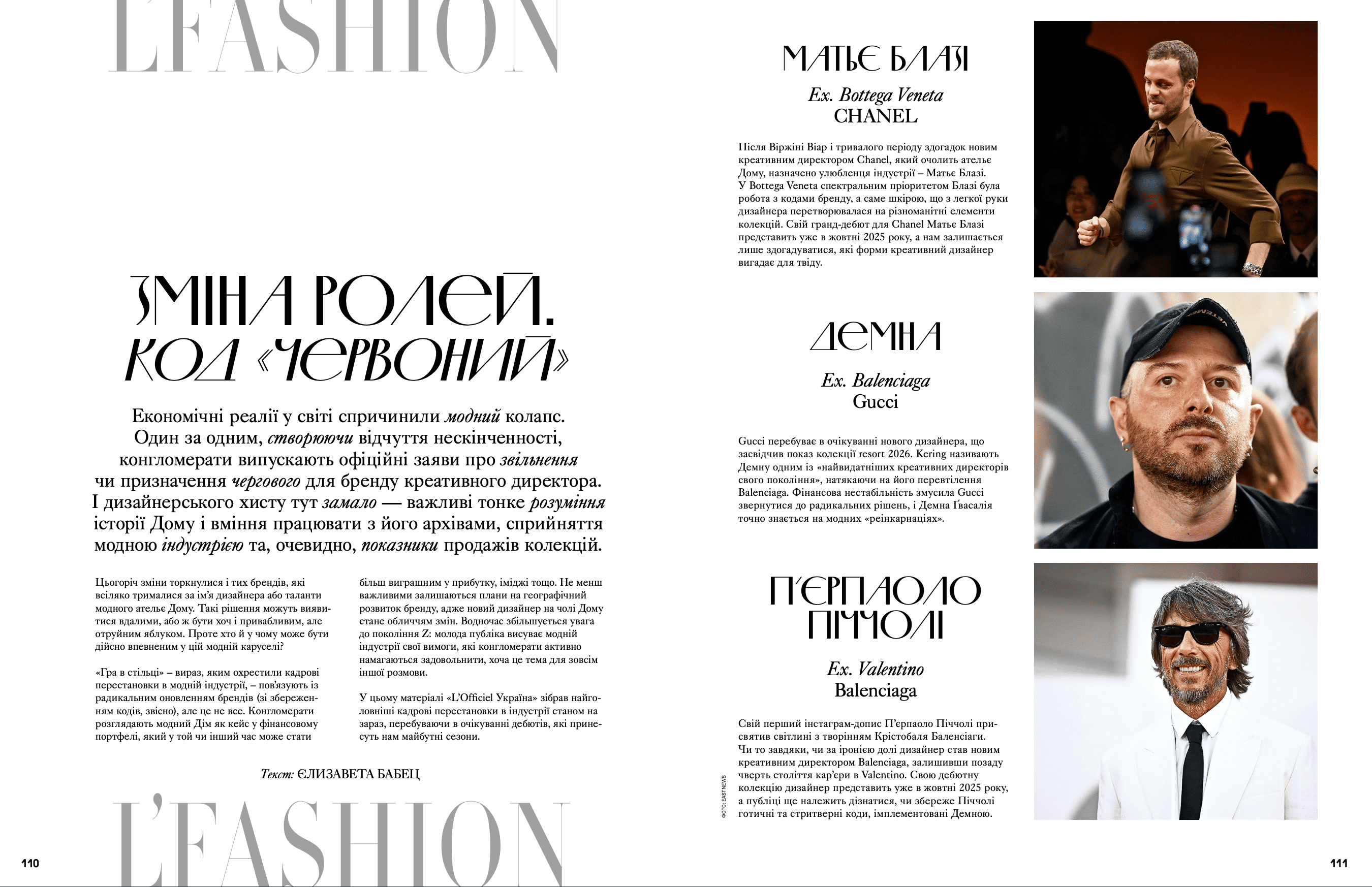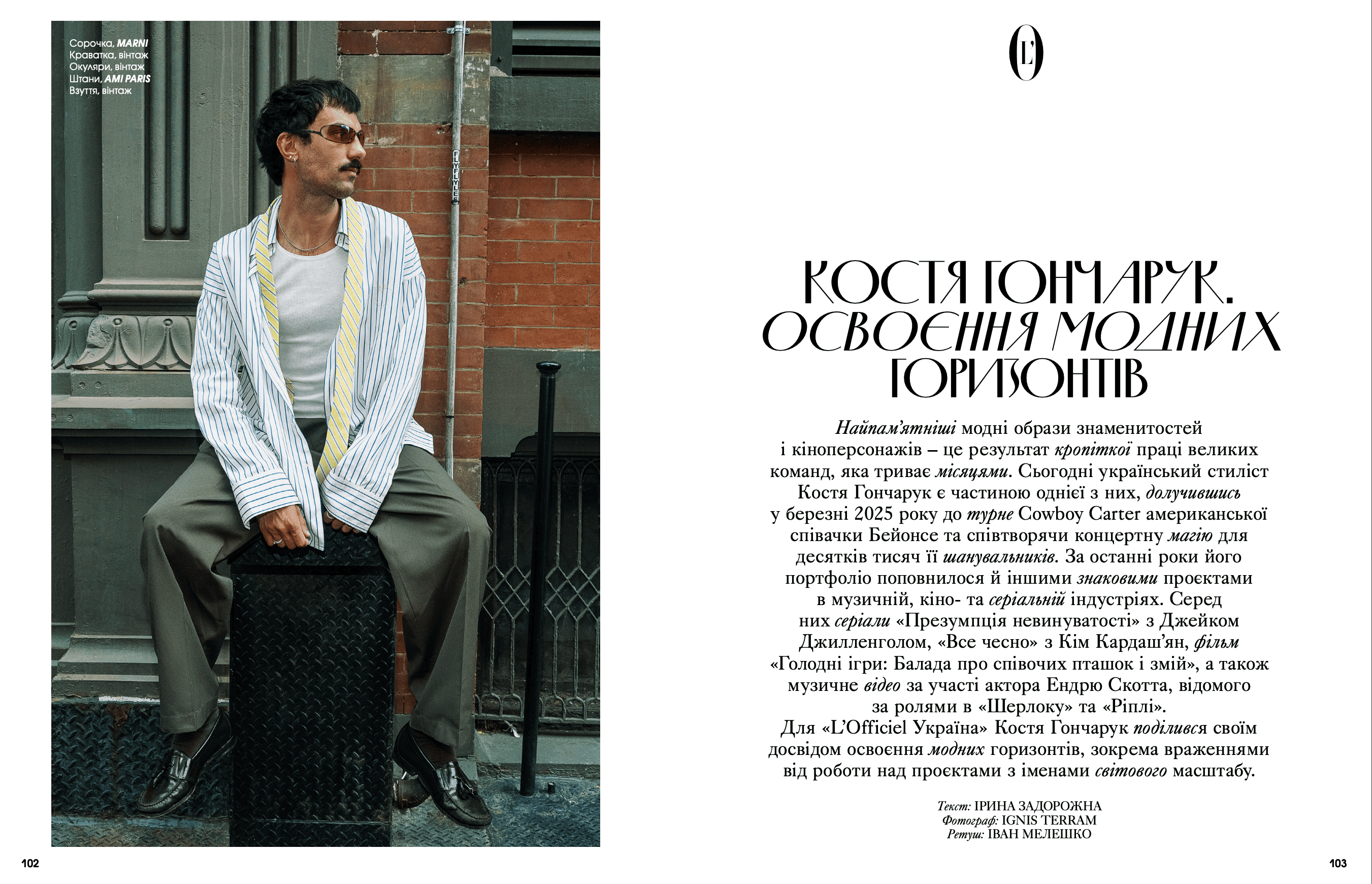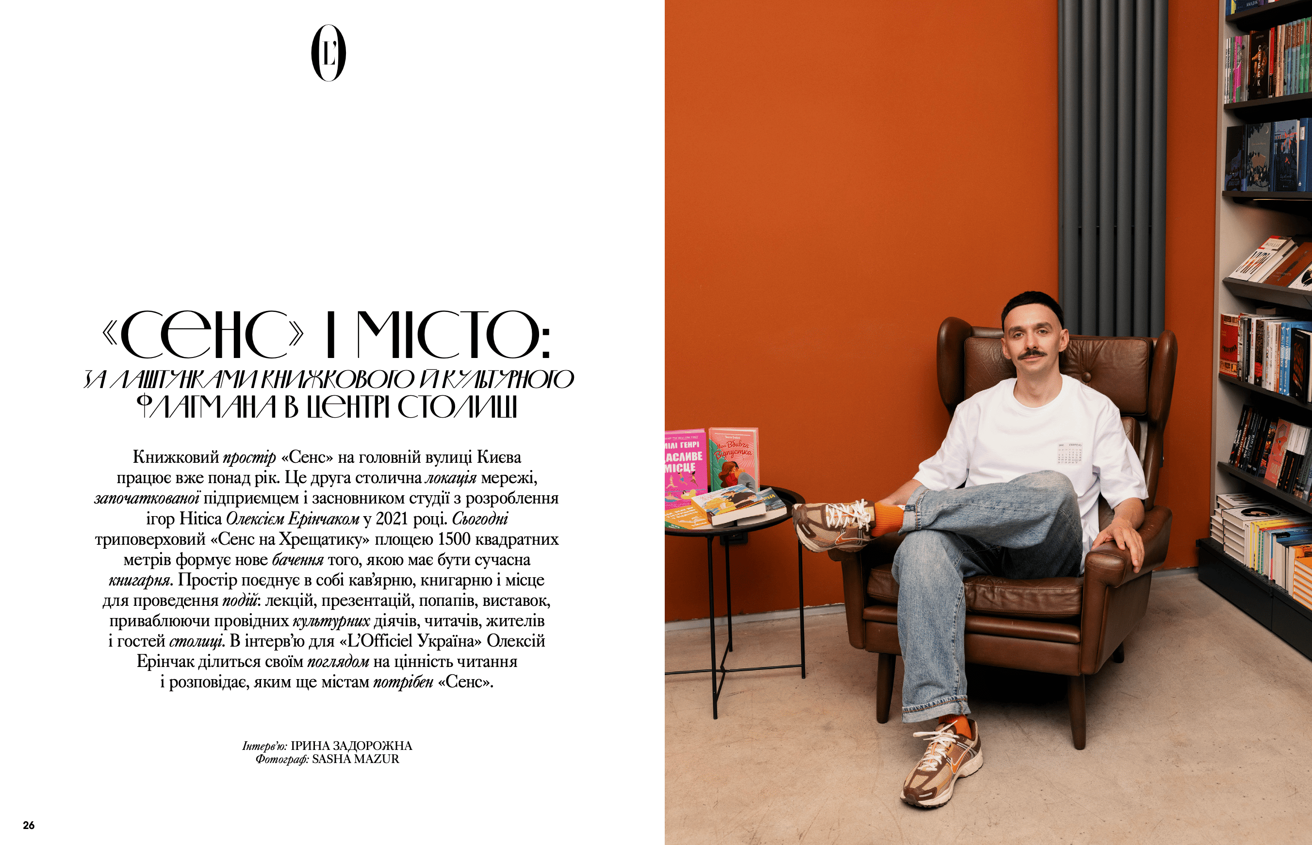 Для літнього числа «L’Officiel Україна» Олексій Ерінчак, засновник «Сенсу на Хрещатику», розповів про концепцію триповерхового книжкового простору в серці столиці. Водночас акторка Карина Химчук поклала надії на міжнародне кіно й переїхала у Великобританію, відвідала Каннський кінофестиваль і виконує свої перші ролі в іноземних фільмах. А стиліст Костя Гончарук, який сьогодні працює в команді концертного туру Бейонсе й одягає героїв провідних серіалів головних кіноплатформ, розповідає про власний творчий шлях і роботу з A-list знаменитостями.