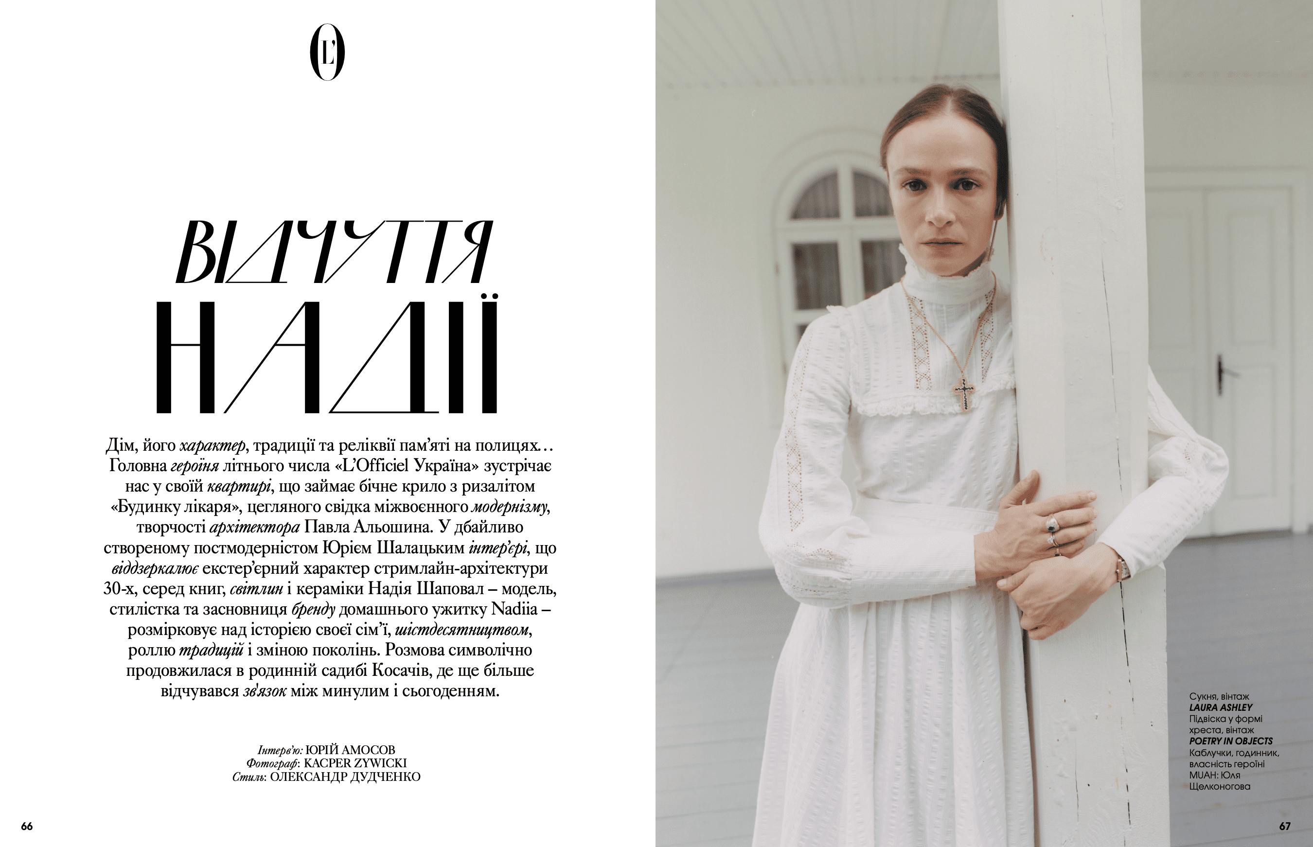 Головна героїня літнього числа «L’Officiel Україна», Надія Шаповал, зустрічає нас у своїй квартирі, що займає бічне крило з ризалітом «Будинку лікаря». Модель, стилістка та засновниця бренду домашнього ужитку Nadiia розмірковує над історією своєї сім’ї, шістдесятництвом, роллю традицій і зміною поколінь.