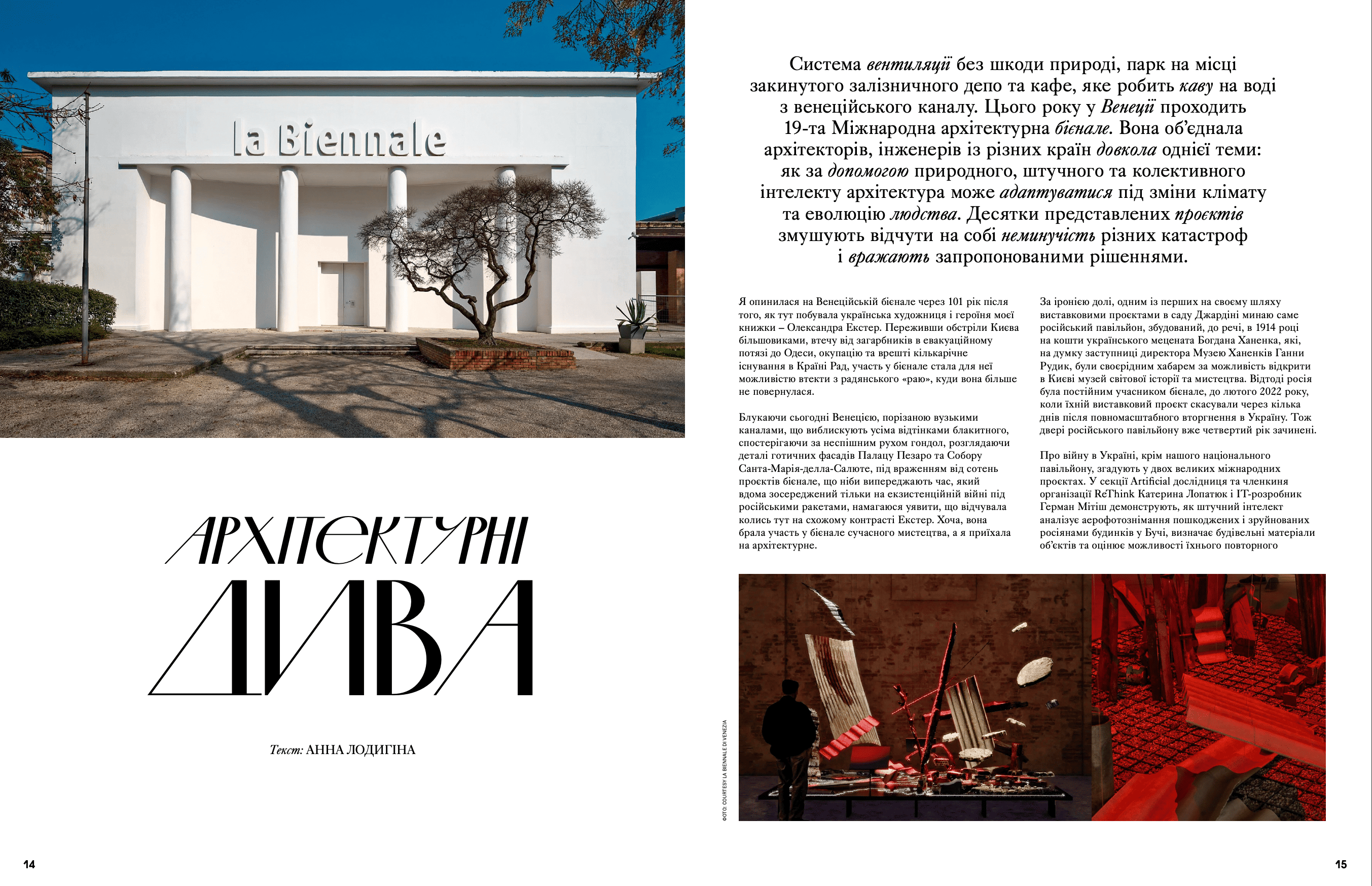 Дев’ятнадцята Міжнародна архітектурна бієнале у Венеції декларувала, що архітектура має і може адаптуватися під зміни клімату й еволюцію людства. Журналістка Анна Лодигіна ділиться, як десятки представлених проєктів змушують відчути на собі неминучість різних катастроф і вражають запропонованими рішеннями.