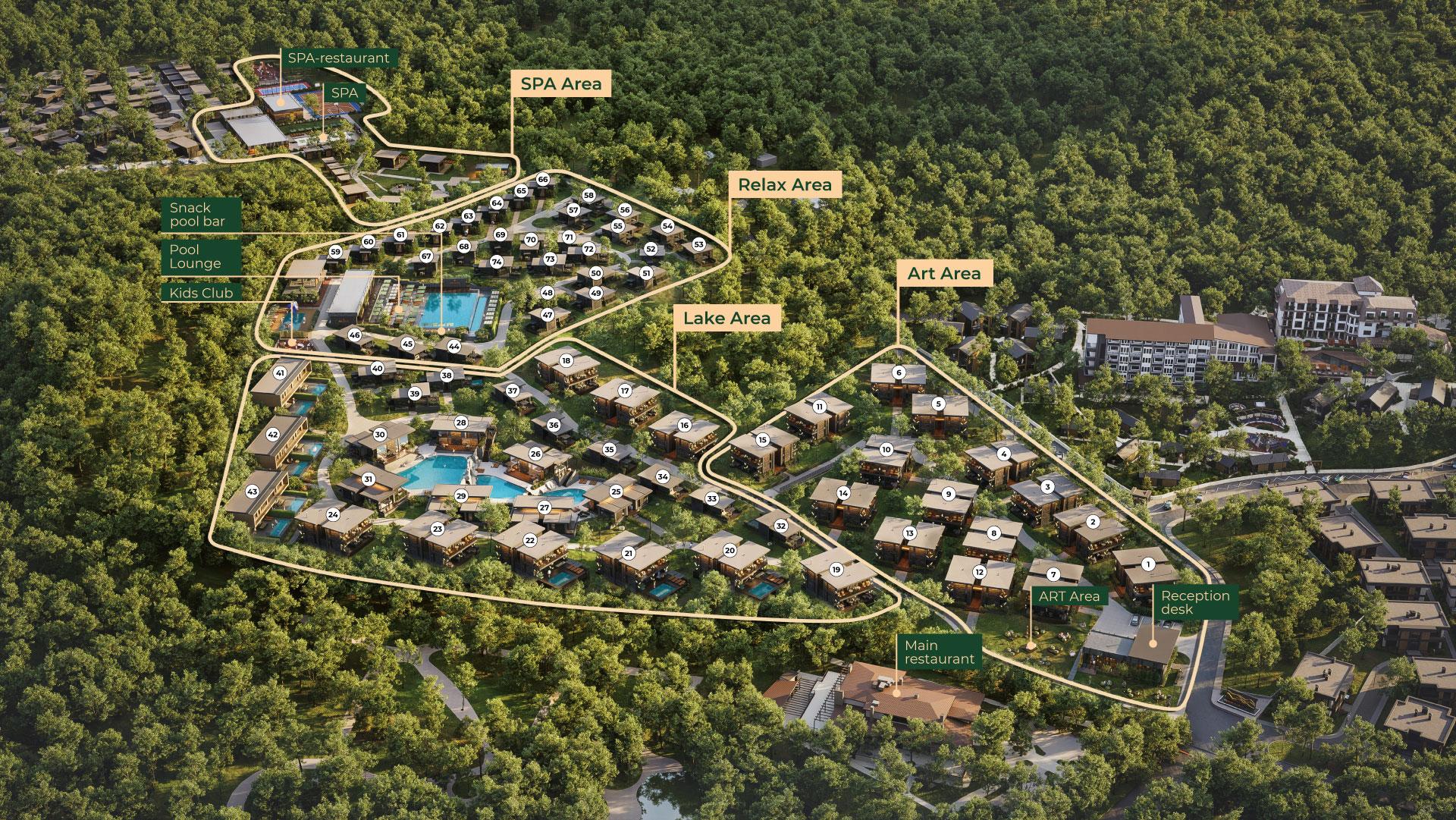 - 37 300 м² території серед мальовничого лісу поблизу морського узбережжя.