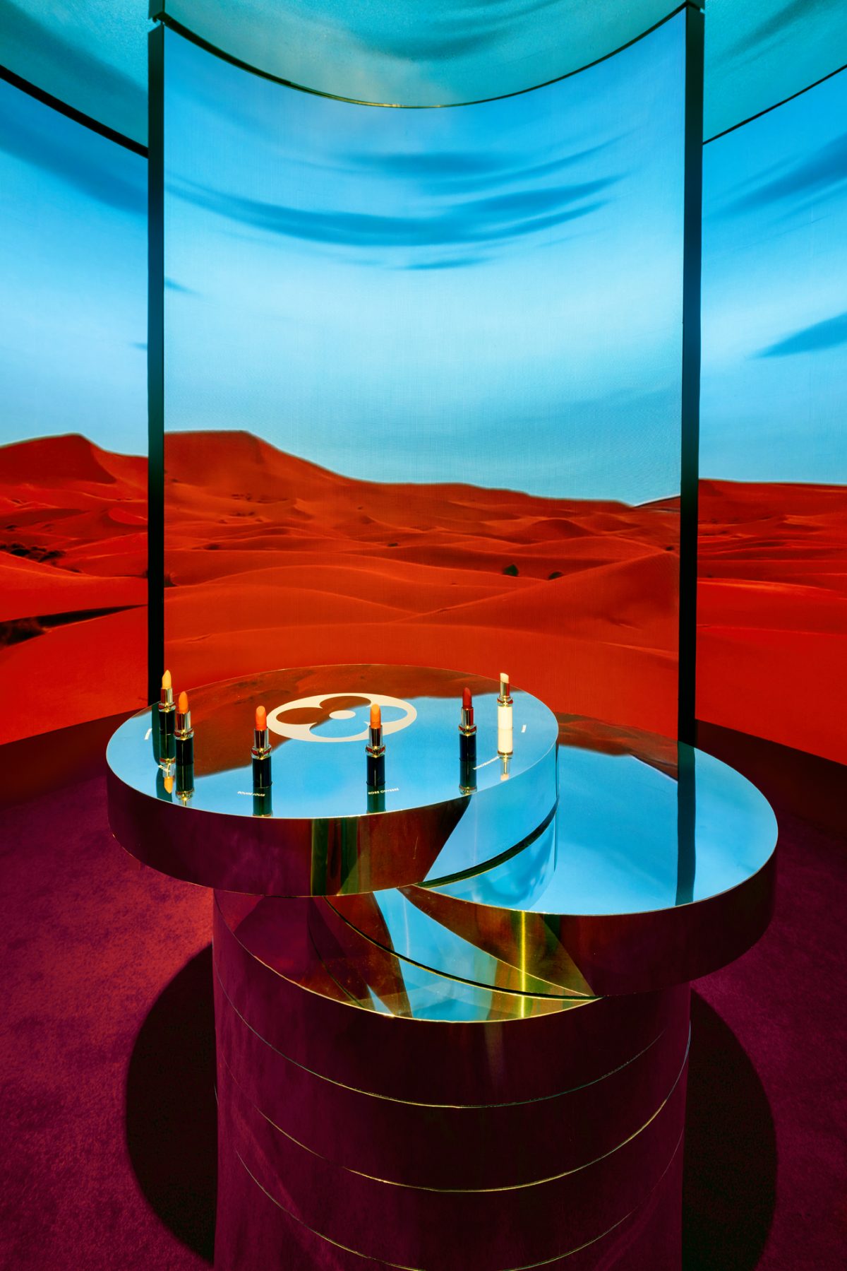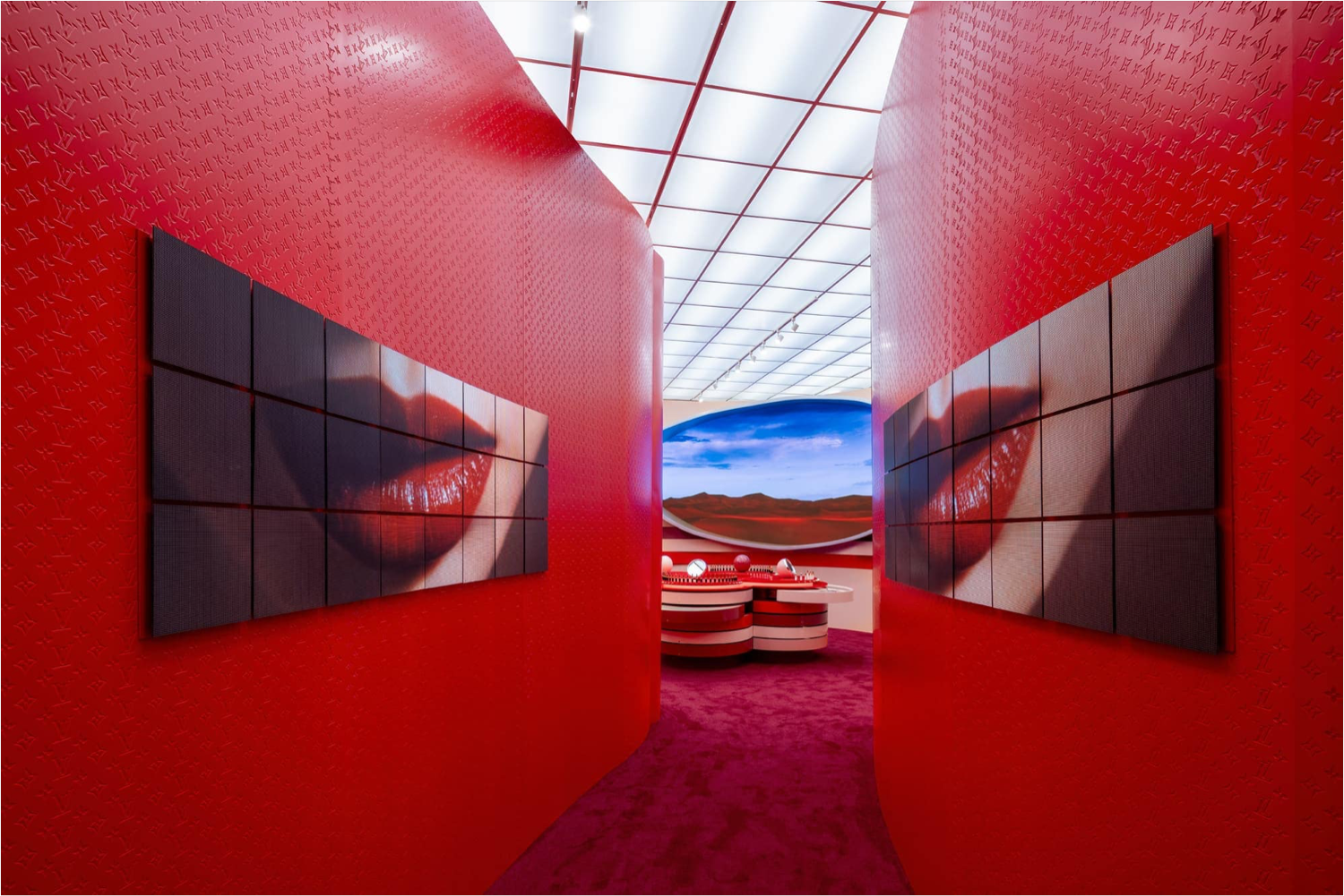 Інтер’єр поп-апу нагадує занурення у новий всесвіт Louis Vuitton. Насичені червоні відтінки, хвилясті полиці, дзеркальні сфери та органічні форми створюють атмосферу, в якій кожен елемент відображає дух колекції. Вхід оформлено у вигляді порталу з 48 цифрових екранів, що миттєво переносять гостей у світ La Beauté.