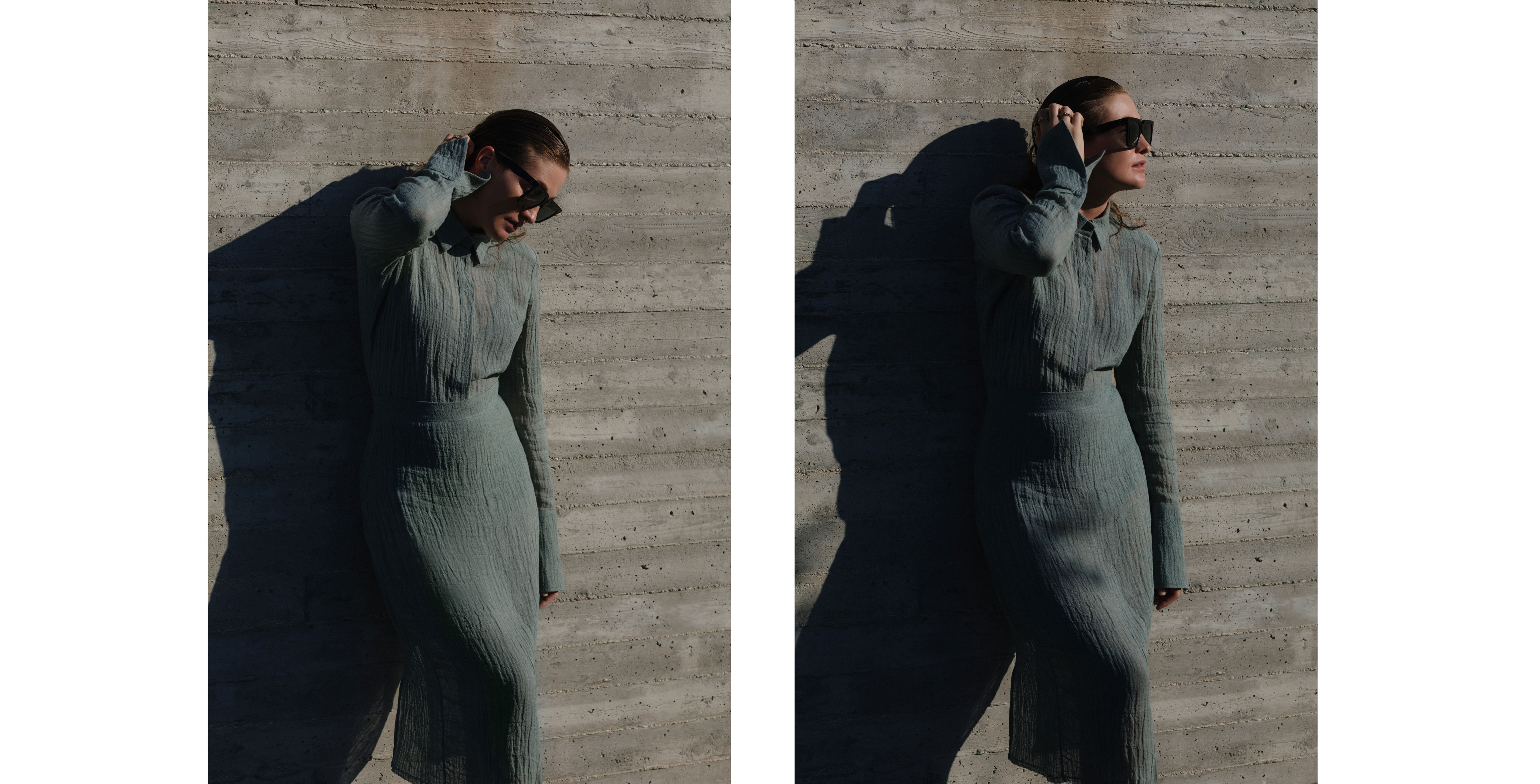 С этим нарядом, как и с мифическими девушками, не все однозначно. В костюме угадываются детали делового стиля: классический воротник и манжеты рубашки. Но полупрозрачная ткань оттенка хаки и высокий разрез юбки выдают волевую природу его обладательницы. Даже солнцезащитным очкам не под силу скрыть это.