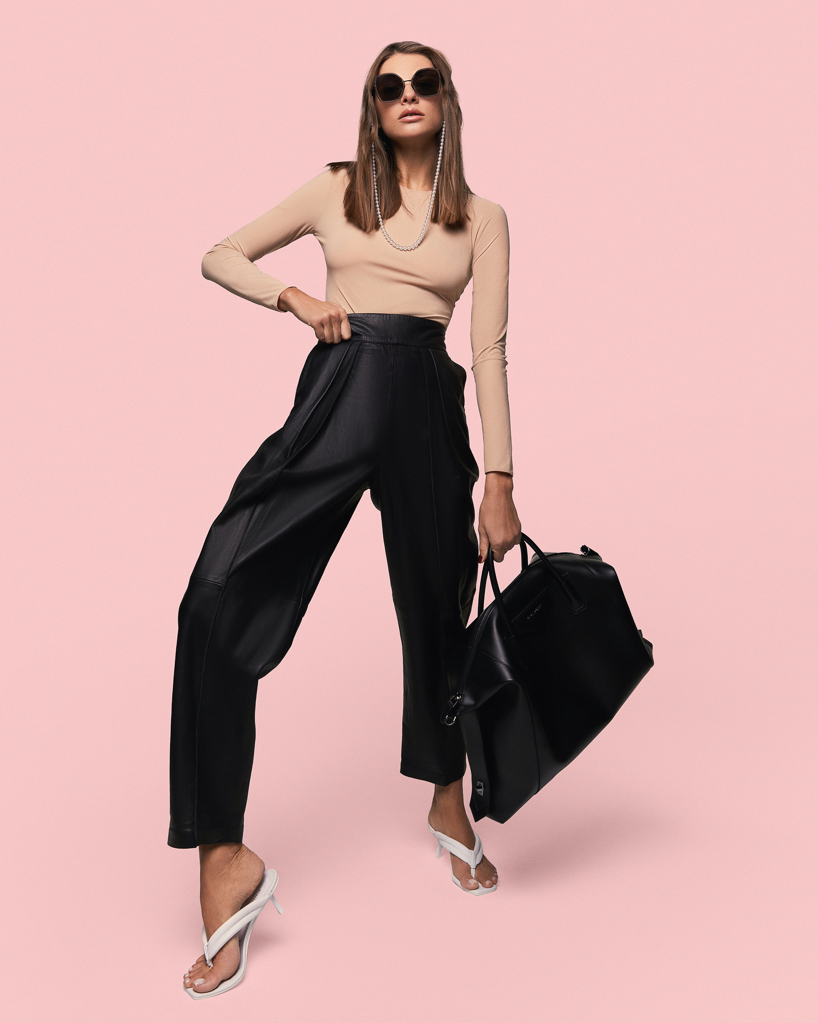 Боди Maison Margiela, брюки Toni Maticevski, сумка Givenchy, флип-флопы Le Silla, очки — собственность стилиста