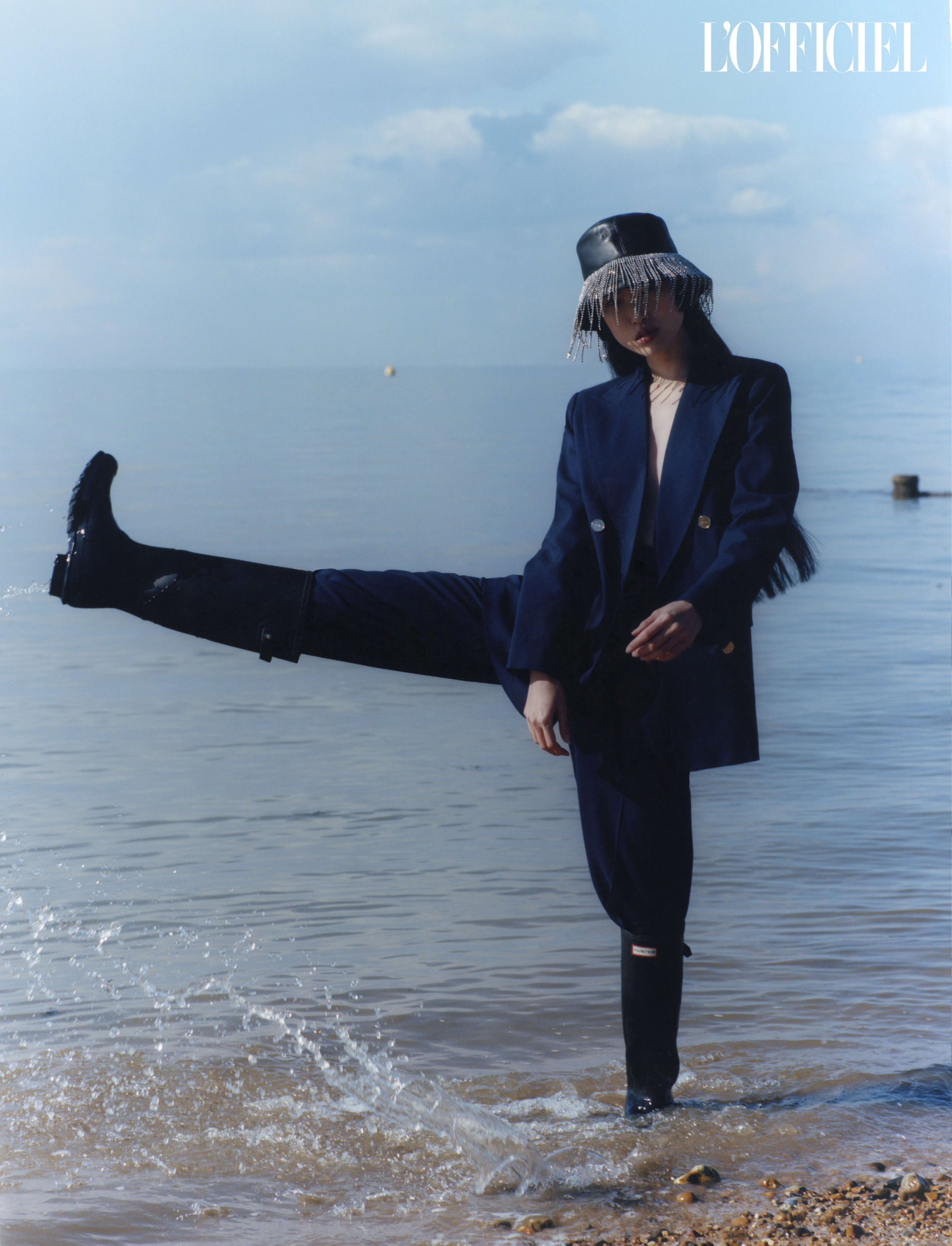 Костюм из вискозы, SANDRO. Кожаная шляпа, KARA. Cапоги из натурального каучука, HUNTER BOOTS