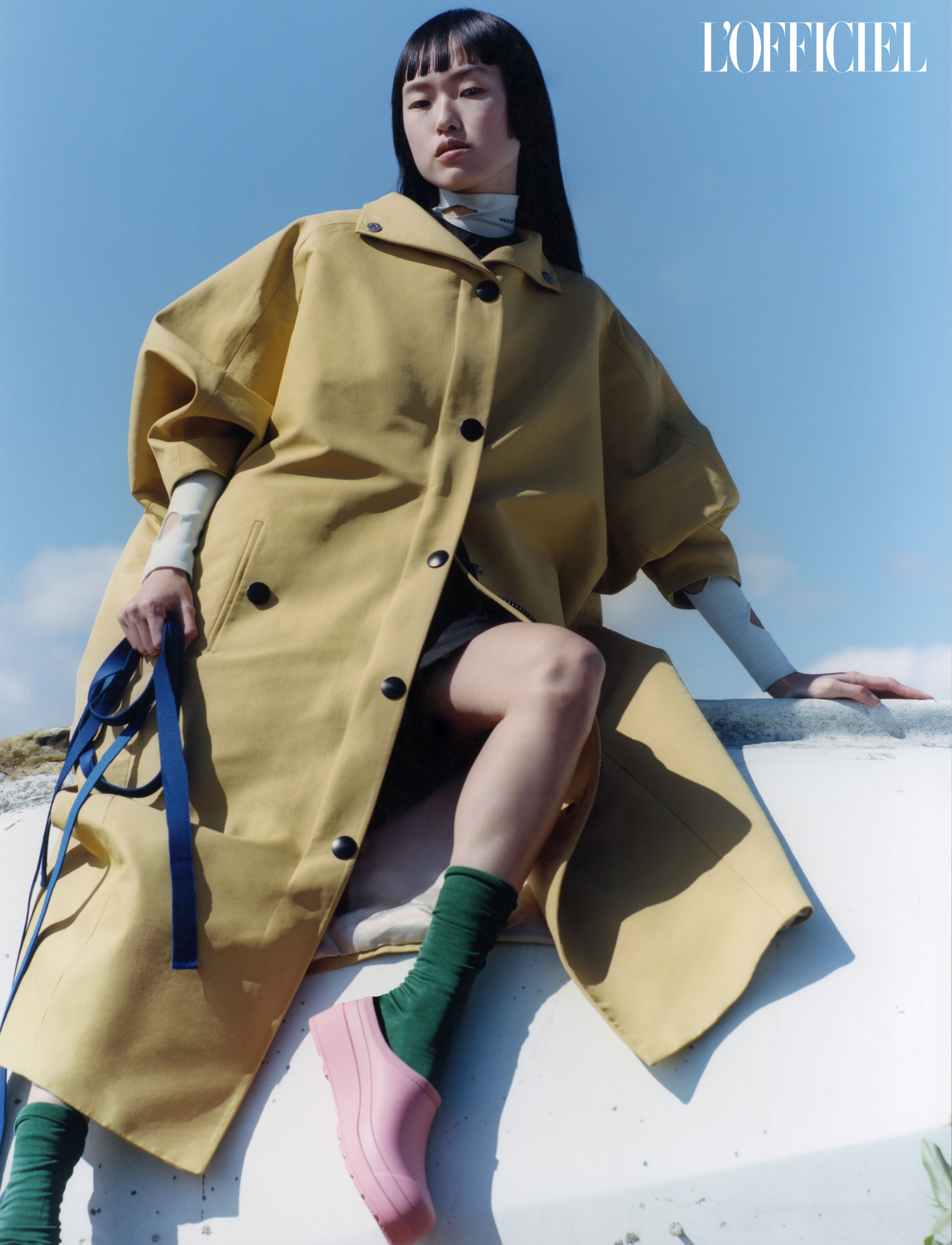 Плащ, платье, водолазка PRADA. Носки из хлопка, FALKE. Сабо из натурального каучука, HUNTER BOOTS