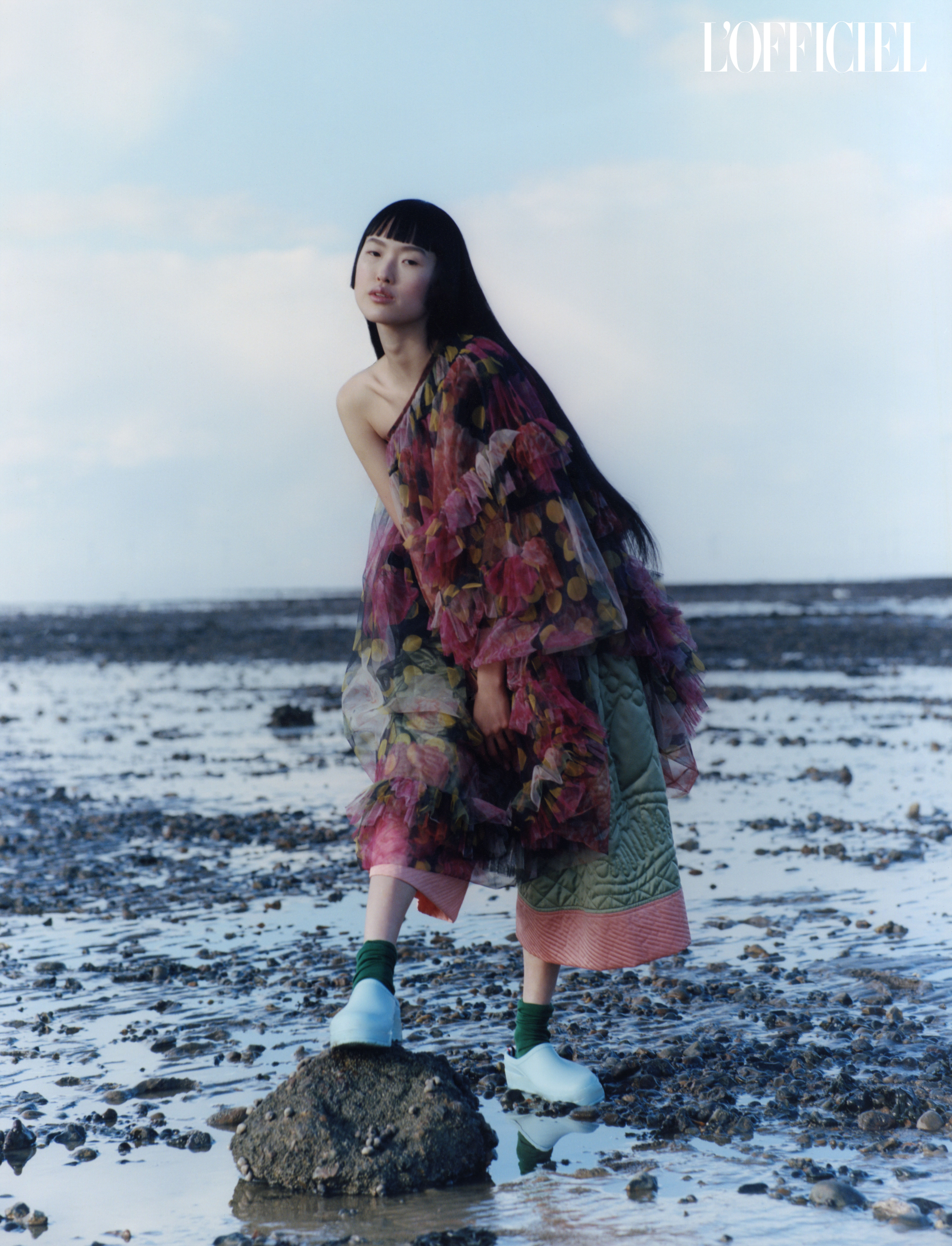Юбка MOLLY GODDARD. Брюки 1 MONCLER JW ANDERSON. Носки FALKE. Сабо HUNTER BOOTS