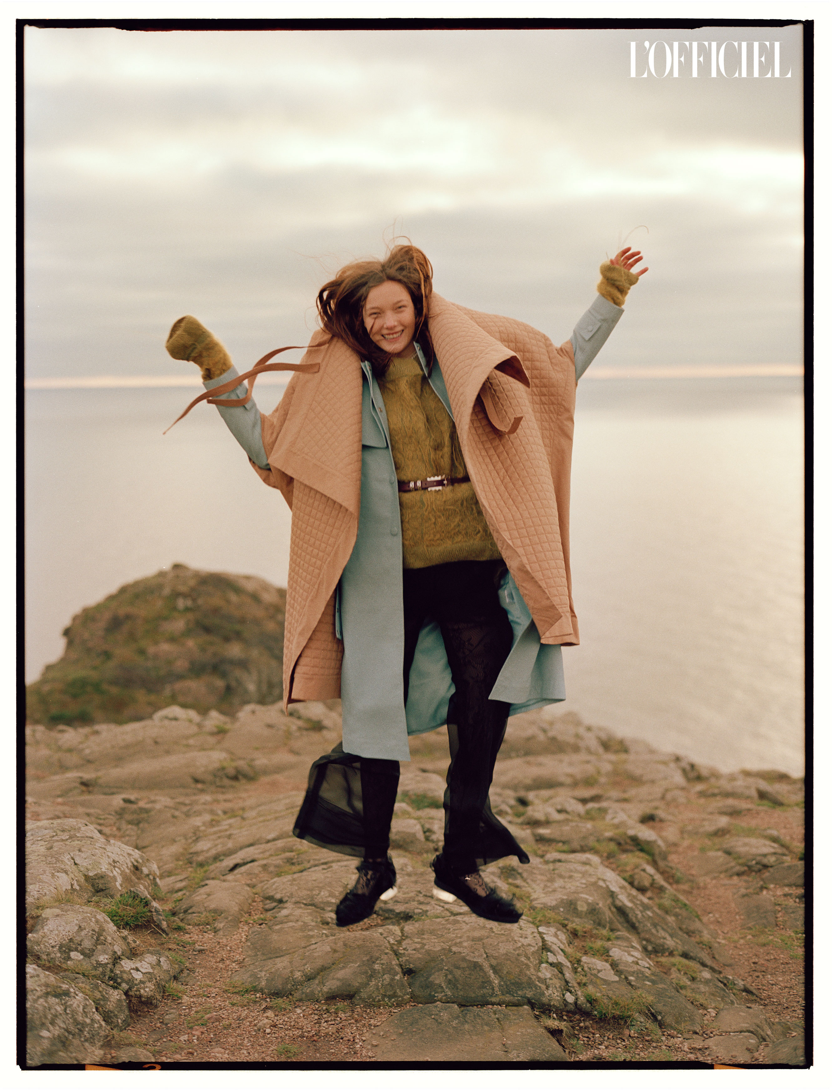 Шляпа LOEWE, платье-рубашка GANNI, пальто ARV COPENHAGEN, перчатки GUCCI, колье MONIES