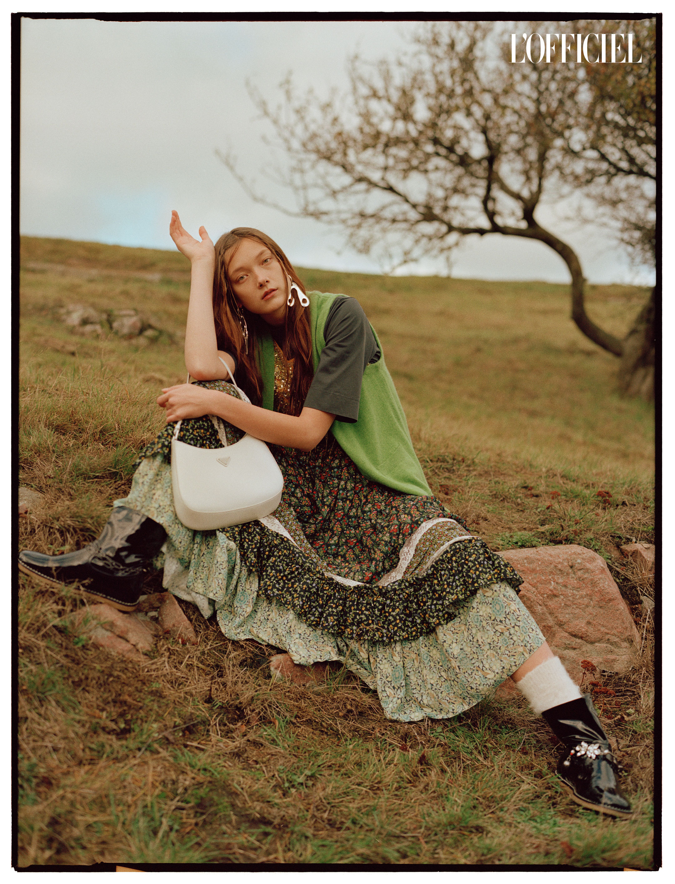 Топ MIU MIU, футболка, жилет, GANNI, юбка, носки GUCCI, сапоги LOEWE, сумка PRADA, серьги JO RIIS-HANSEN X MARK KENLY DOMINO TAN