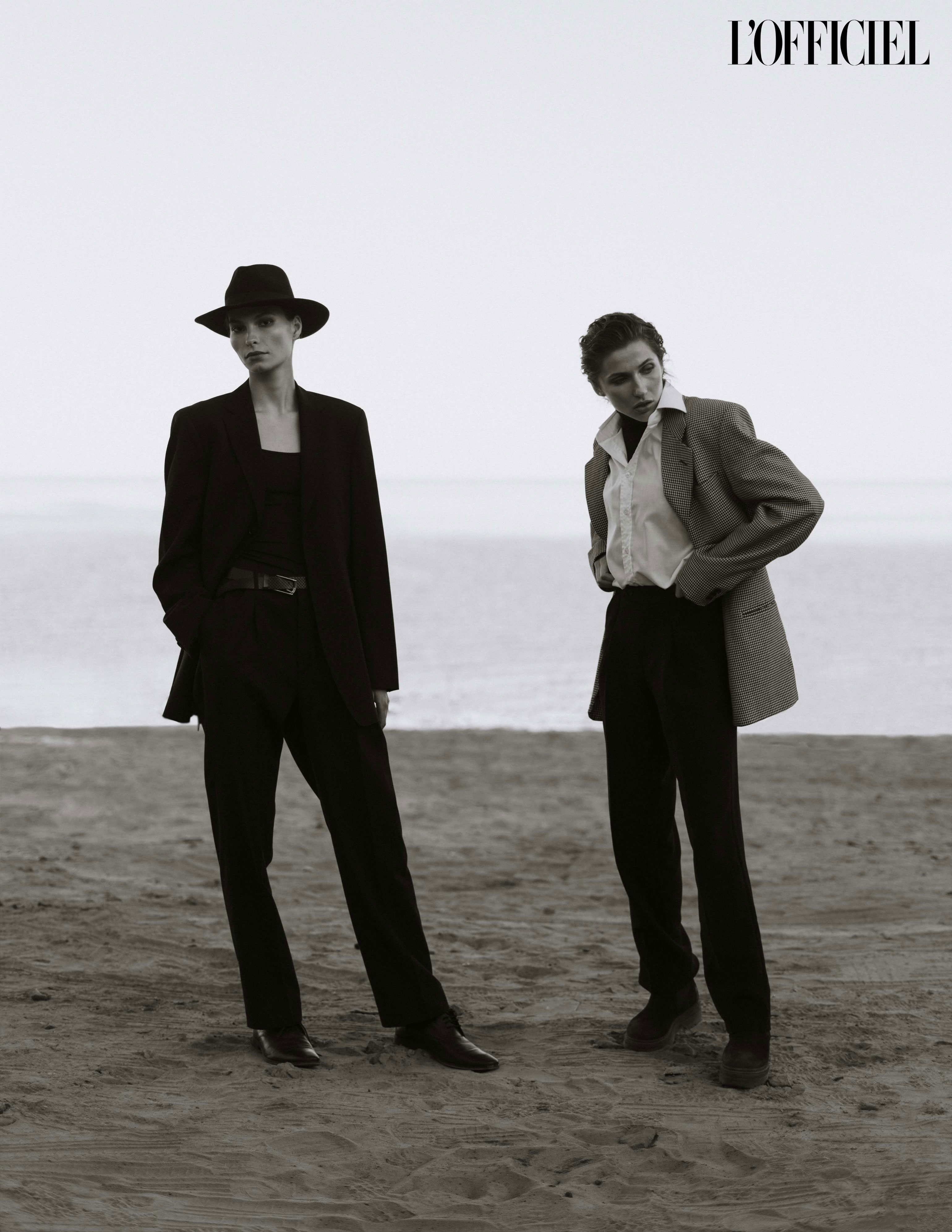 Слева: пальто Max Mara; костюм с кроп-жакетом Oversized Studio; топ Frankie Shop. Справа: рубашка Saint Laurent; брюки Oversized Studio; ботинки Prada
