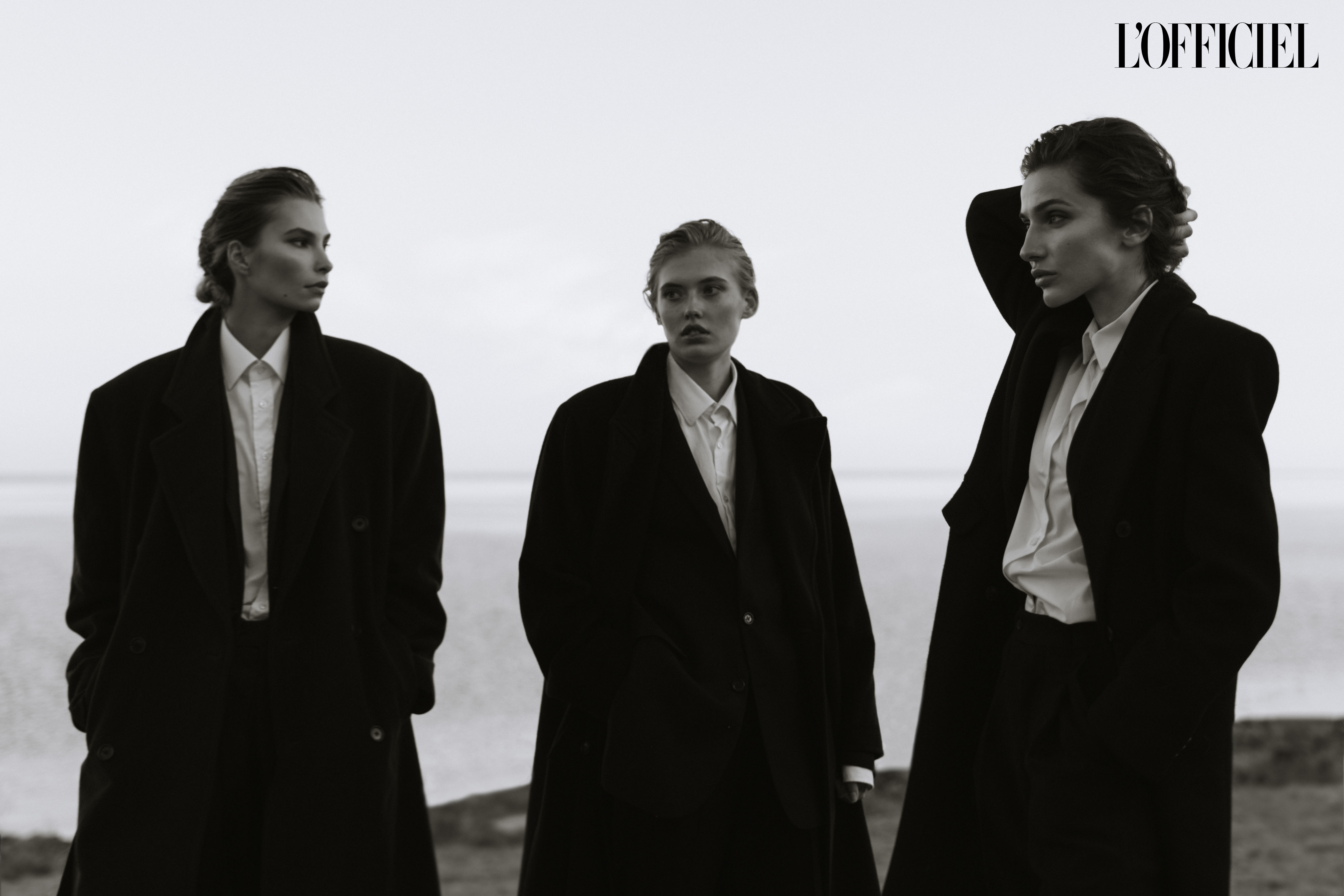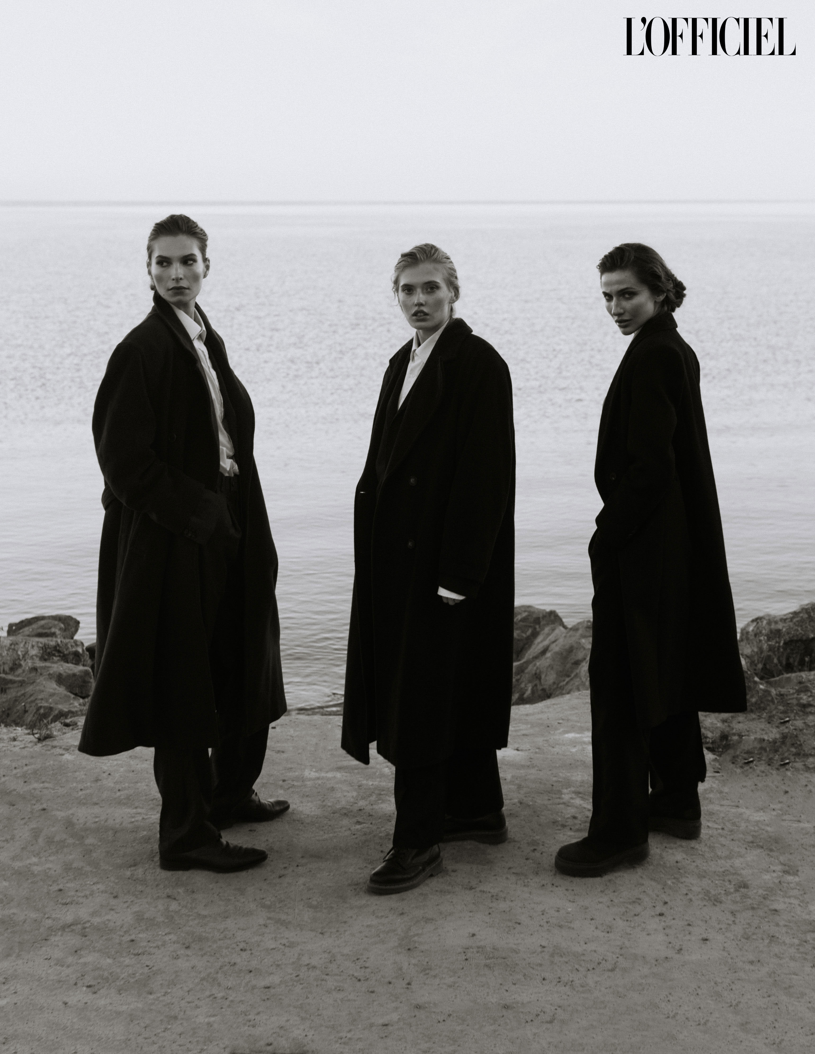 Дарина (слева): пальто Hugo Boss; костюм Oversized Studio; рубашка Calvin Klein; туфли Tommy Hilfiger. Вита (по центру): пальто Max Mara; костюм Oversized Studio; рубашка Karl Lagerfeld; ботинки Dr. Martens. Анастасия (справа): пальто Zara; костюм Oversized Studio; рубашка Guess; ботинки Prada