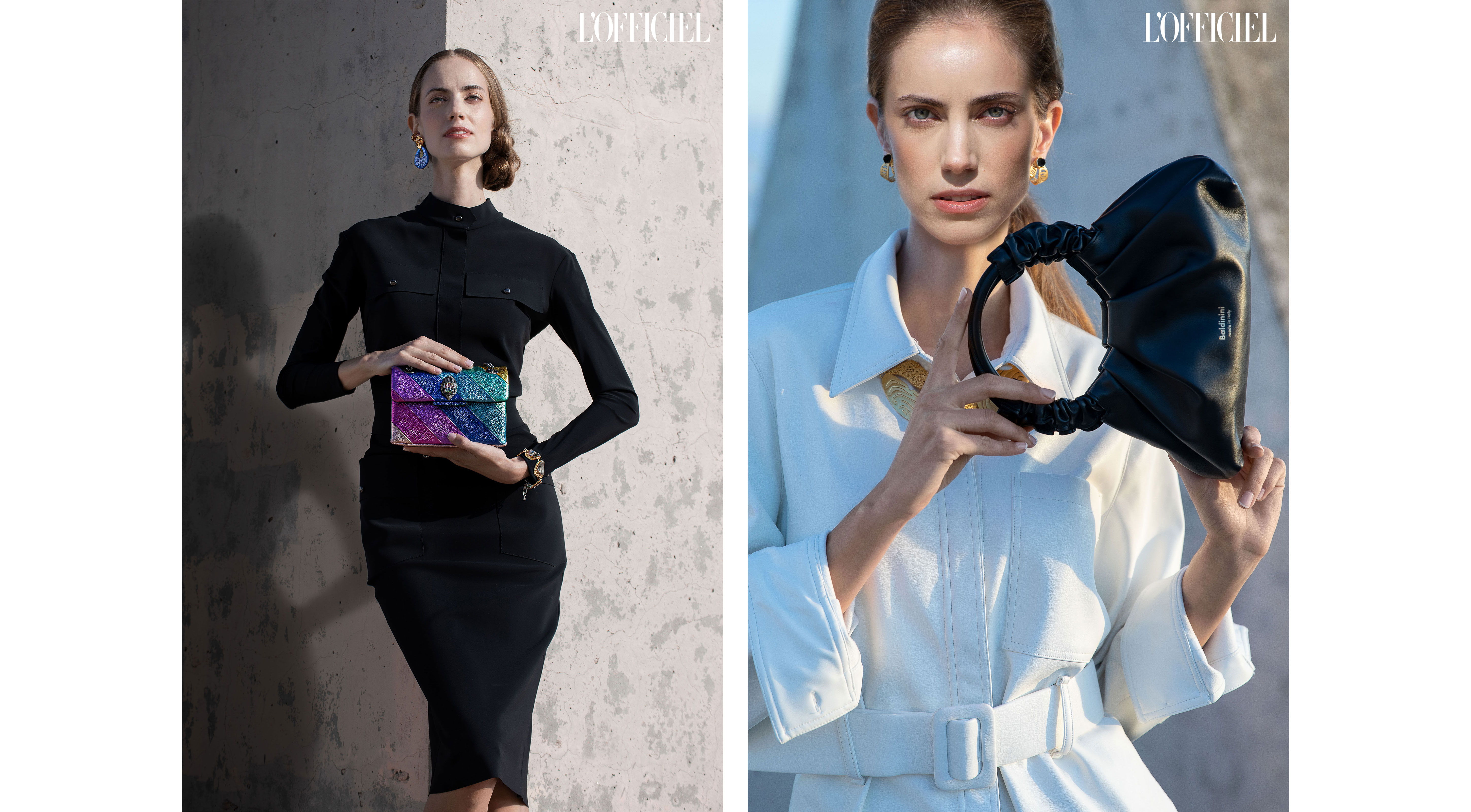 Слева: Платье Chiara Boni, сапоги Baldinini, сумка Kurt Geiger, аксессуары Jude Benhalim. Справа: Кожаная куртка Jijil, джинсы Ice Play, сапоги и шляпа Karl Lagerfeld, сумка Baldinini, аксессуары Jude Benhalim