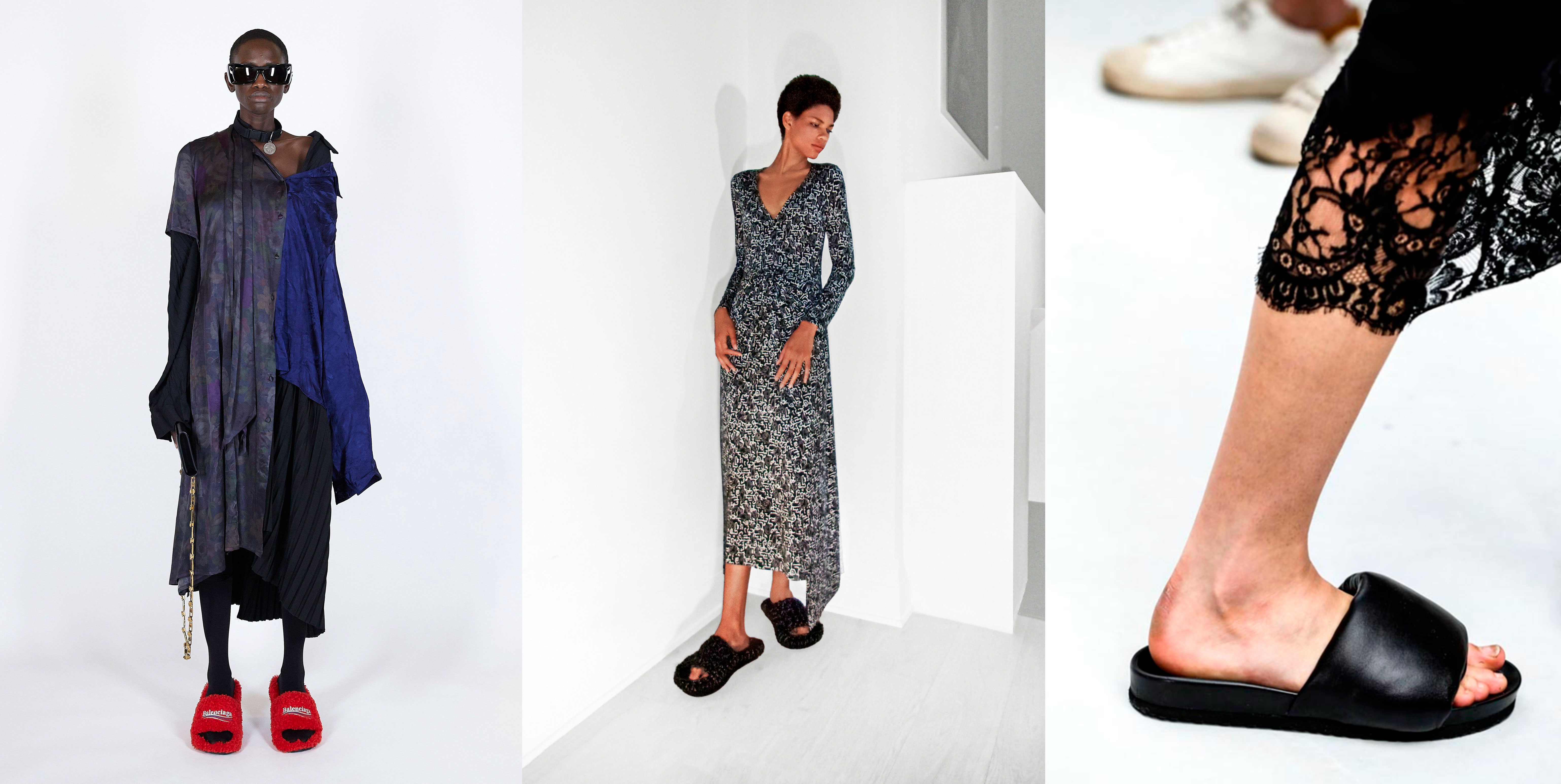 Еще один гол в пользу удобства и уюта — модные версии домашних или отельных тапочек. Мы так долго были дома, что уже не терпится отправиться в путешествие, пусть даже в пределах родной страны. В любом случае нам пригодится пара удобной и мягкой обуви. Почему бы не прогуляться в таких, дополнив их шелковым платьем, плиссированной юбкой или строгим брючным костюмом?