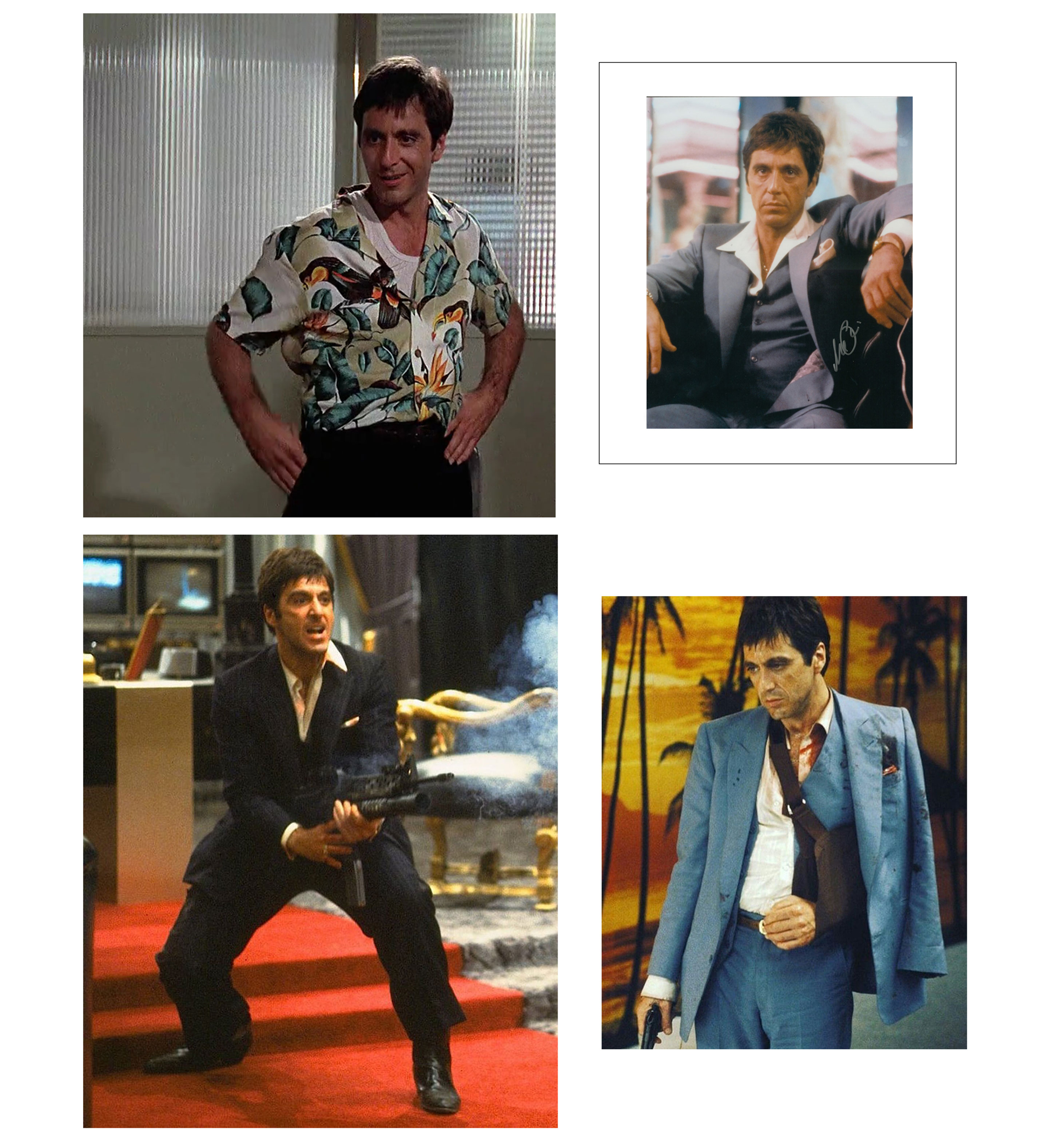 В первых сценах фильма будущий наркобарон и авторитет, а пока еще политический беженец с Кубы (как он сам себя называет), Тони появляется в пёстрых гавайских рубашках с крупными цветочными принтами. Мы видим человека, который явно любит заявить о себе. Соратники Тони носят более сдержанные узорчатые или однотонные рубашки. Немного погодя, когда Монтана ввязывается в кровавую переделку, из которой выходит победителем и предъявляет свои права на управление делами нью-йоркского мафиозного клана, на нём можно заметить белый костюм с контрастными черными лацканами. В таком костюме Тони впервые за 5 лет приходит в дом своей матери, откуда она его в ужасе выгоняет, порицая за пижонский вид и опасный образ жизни.