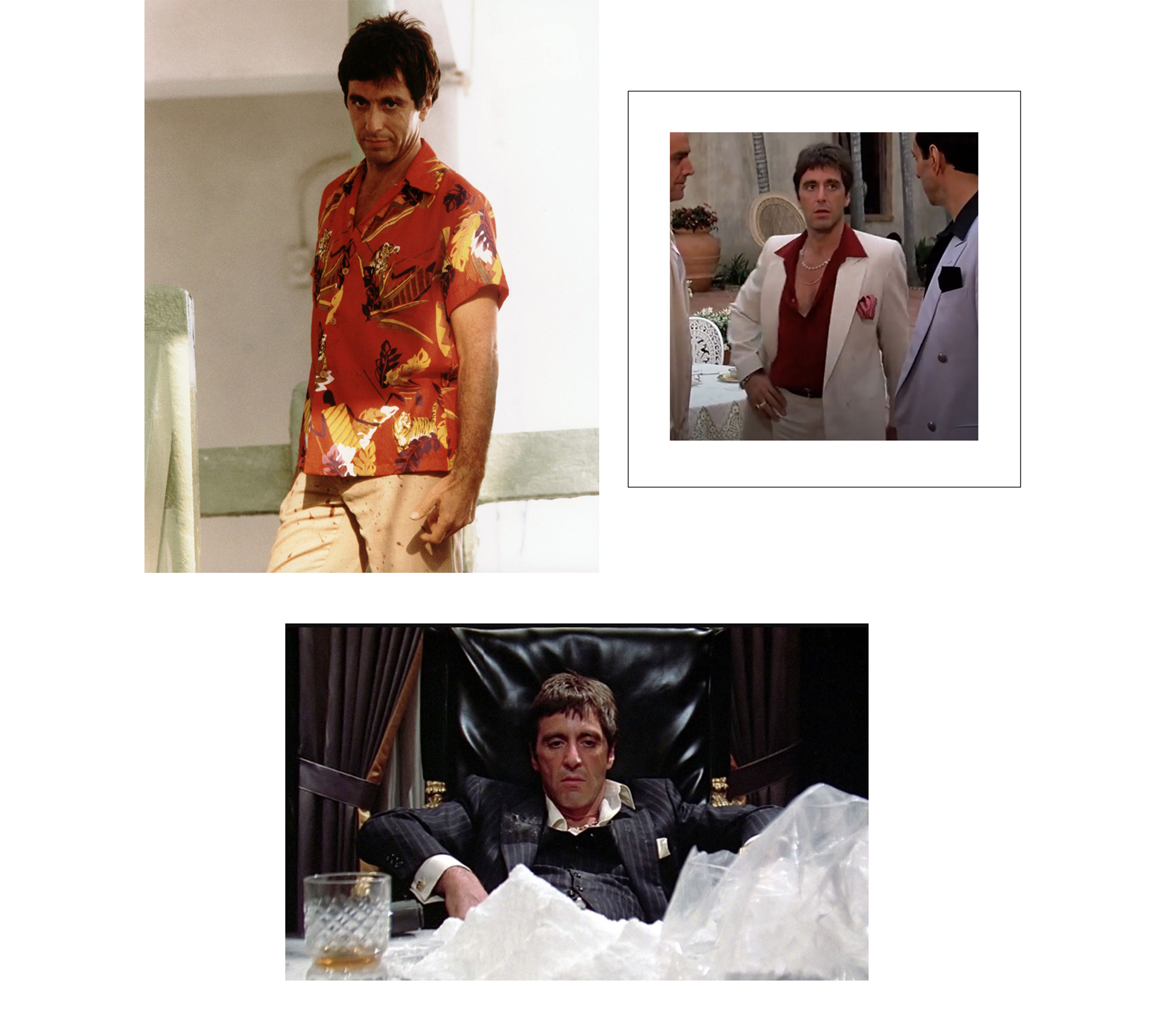 До момента становления в качестве несокрушимого босса мафии Монтана носил достаточно пижонские костюмы пастельных оттенков и шелковые рубашки. На Манхэттене герой Аль Пачино появлялся в консервативном деловом костюме, мудро мимикрируя под местных больших боссов. На своей же вилле Тони предстаёт в дендистской тройке из шерсти оттенка Navy в чередующуюся узкую и широкую полоску. По индивидуальным меркам Аль Пачино костюм также изготовил Томми Веласко.